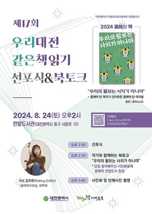 대전시와 희망의책 대전본부는 올해 대전시민이 함께 읽을 한 권의 책으로 김지우 작가의 ‘우리의 활보는 사치가 아니야’를 선정했다. 이번 선정을 기념하기 위해 24일 오후 2시, 한밭도서관에서 ‘우리 대전 같은 책 읽기’ 운동의 선포식이 열릴 예정이다.‘우리의 활보는 사치가 아니야’는 김지우 작가가 유튜버 '구르님'으로 활동하며 장애인의 이동권 문제를 조명한 책이다. '휠체어 탄 여자가 인터뷰한 휠체어 탄 여자들'이라는 부제와 함께 10대부터 60대까지의 장애 여성들이 겪는 한국 사회의 현실을 인터뷰 형식으로 담아낸 도서다.이번 선포