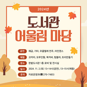 2024년 한밭도서관 어울림 마당이 11월 2일 한밭도서관 전시실에서 열린다. 이번 행사는 한 해 동안 도서관 문화학교와 생활문화센터 강좌에서 배운 성과를 공유하는 자리로, 수강생과 동아리 회원들이 참여한다. 어울림 마당은 공연, 전시, 체험 부스로 구성된다. 공연에서는 해금, 기타, 우쿨렐레 연주와 라인댄스 공연이 펼쳐질 예정이다. 11월 2일부터 12월 1일까지 진행되는 전시에는 보태니컬 아트, 압화작품, 세밀화, 캐리커처, 공예작품, 아트북 작품 등이 선보인다. 체험 부스에서는 책 읽기, 모루인형 만들기, 북커버 제작, 텀블러