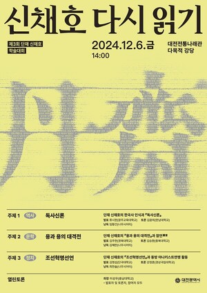 대전시는 단재 신채호 선생 탄신 144주년을 맞아 오는 6일 대전전통나래관에서 '제3회 단재 신채호 학술대회'를 개최한다.이번 학술대회는 단재의 대표적 저술인 '독사신론', '용과 용의 대격전', '조선혁명선언서'를 중심으로 한국 근대 지성사에서 신채호 선생의 사상적 좌표를 재조명하는 발표들로 꾸며진다.정통 유학자에서 출발해 언론인, 무장 독립운동 이론가, 아나키스트에 이르기까지 신채호 선생의 삶과 사상은 한국 근대 지성사 전반을 투영한다. 이에 따라 그의 저작 역시 방대한데, 이번 학술대회에서는 역사·문학·정치 세 분야로 나누어