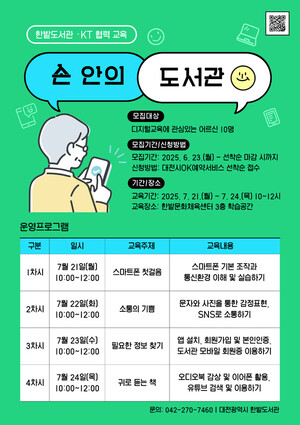 한밭도서관은 오는 7월 21~24일 55세 이상 시민을 대상으로 스마트폰 활용 교육 프로그램 '손 안의 도서관'을 운영한다고 밝혔다. 이 프로그램은 디지털 소외 해소를 위해 ㈜KT와 협력해 마련된 민관 공동사업으로, 스마트폰 기초부터 도서관 모바일 서비스 활용까지 실생활 중심의 교육을 제공한다.교육은 한밭문화체육센터 3층 강의실에서 매일 오전 10시부터 12시까지 총 4회에 걸쳐 진행된다. 스마트폰을 처음 접하는 시니어도 쉽게 따라올 수 있도록 인쇄형 보조자료가 제공되며, 실습 위주의 수업 방식으로 구성됐다.1일 차에는 스마트폰의