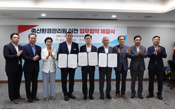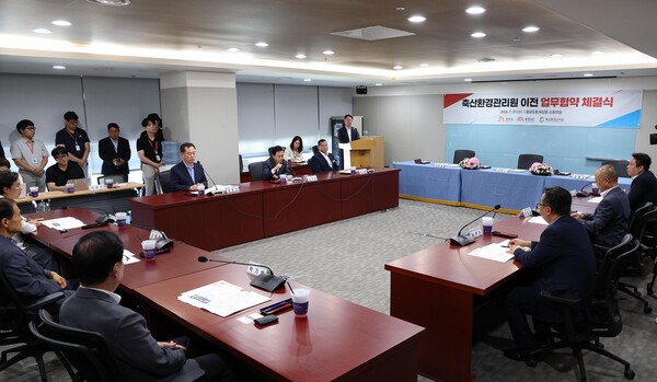 충남도가 정부 산하 공공기관인 축산환경관리원을 공주시에 유치하는 데 성공했다. 31일 도청 소회의실에서 김태흠 충남도지사, 문홍길 축산환경관리원장, 최원철 공주시장이 참석한 가운데 '축산환경관리원 청사 이전을 위한 업무협약'을 체결했다. 축산환경관리원은 2028년까지 285억 원을 투입해 공주시 동현동 일원에 연면적 9,400㎡ 규모의 신청사를 건립할 예정이다. 이번 유치는 지난해 10월 한국식품안전관리인증원 유치에 이은 성과로, 두 기관이 본격 가동되면 연간 약 4만 명이 공주를 방문해 지역경제 활성화에 기여할 것으로 기대된다. 협약에 따라 충남도는 정부예산 확보와 행정 절차 지원에, 축산환경관리원은 충남과 공주 발전을 위한 협력에, 공주시는 부지 제공과 행정 절차 협조에 각각 힘쓰기로 했다. 도 관계자는 축산환경관리원 이전 완료 후 연간 2만 명의 교육생 유치를 통해 573억 원의 경제적 효과와 209명의 취업 유발 효과를 예상했다. 김태흠 지사는 "충남은 공공기관 입지 최적지"라며 신속한 이전을 위해 노력하겠다고 밝혔다. 한편, 지난해 유치한 한국식품안전관리인증원도 2027년까지 295억 원을 투입해 공주시 동현동에 신청사를 건립할 예정이다. /이영준 기자