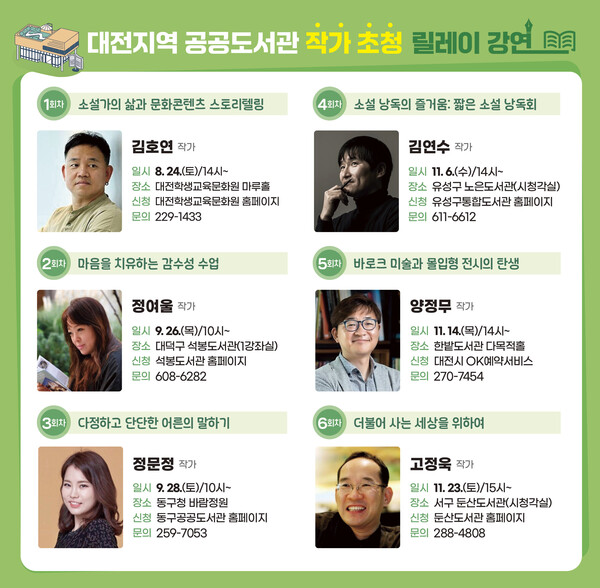 한밭도서관이 오는 24일부터 11월 23일까지 대전지역 공공도서관과 협력하여 '대전지역 공공도서관 작가초청 릴레이 강연회'를 개최한다. 이번 강연회는 대전 각 구별 거점도서관에서 1회씩 릴레이 형식으로 진행되며, 다양한 분야의 작가들을 초청해 그들의 작품 세계와 창작 과정을 나누는 자리로 마련된다. 이를 통해 대전시민의 인문적 소양을 높이고 독서문화를 확산시키는 것을 목표로 한다. 강연회는 총 6회에 걸쳐 진행된다. 첫 번째 강연은 8월 24일 대전학생교육문화원에서 김호연 작가가 ‘소설가의 삶과 문화콘텐츠 스토리텔링’을 주제로 시작한다. 이어서 9월 26일 석봉도서관에서는 정여울 작가가 ‘마음을 치유하는 감수성 수업’을 진행하고, 9월 28일에는 동구청 바람정원에서 정문정 작가가 ‘다정하고 단단한 어른의 말하기’를 주제로 강연한다. 11월로 넘어가면 6일 노은도서관에서 김연수 작가의 ‘소설 낭독의 즐거움’, 14일 한밭도서관에서 양정무 작가의 ‘바로크 미술과 몰입형 전시의 탄생’ 강연이 이어진다. 마지막으로 11월 23일 둔산도서관에서 고정욱 작가가 ‘더불어 사는 세상을 위하여’를 주제로 강연을 마무리한다. 이번 강연회는 대전시민 누구나 무료로 참여할 수 있으며, 참여를 원하는 시민들은 대전시 OK예약서비스 또는 각 구 도서관의 홈페이지를 통해 선착순으로 접수할 수 있다. /이성재 기자