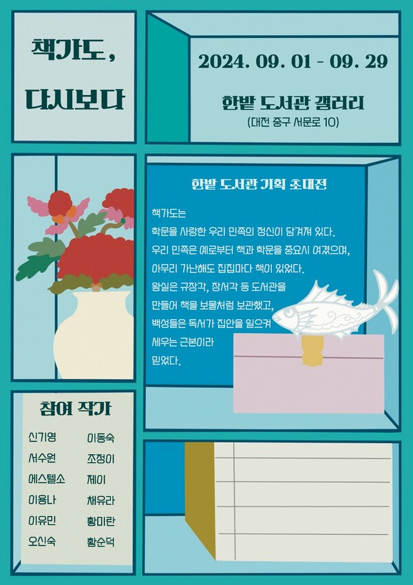 대전시 한밭도서관이 이달 29일까지 본관 1층 전시실에서 ‘책가도, 다시 보다’ 전시를 연다. 이번 전시에서는 신기영 작가를 비롯해 총 12명의 작가들이 전통 회화인 ‘책가도’를 현대적으로 재해석한 60여 점의 작품을 선보인다. ‘책가도’는 책 선반에 진열된 책과 각종 문방구, 그릇 등을 그린 그림으로, 책거리나 문방도 등으로도 불린다. 이번 전시는 전통 책가도의 아름다움을 현대 미술의 다양한 기법과 매체와 결합하여 관람객들에게 새로운 예술적 경험을 제공할 예정이다. 특히 변화하는 시대 속에서 책가도의 의미를 재정의하고, 관람객들이 직접 참여해 전시를 더욱 즐길 수 있는 기회를 제공한다. 김혜정 대전시 한밭도서관장은 "책가도에 담긴 우리 문화를 이해하고 선비들의 책과 학문에 대한 열정을 경험하는 계기가 되기를 바란다"고 전했다. /이성재 기자 이성재 기자 a1065@sejongilbo.co.kr 다른기사 보기 저작권자 © 세종일보 무단전재 및 재배포 금지 당신만 안 본 뉴스 한화 불꽃축제 30일 개최…대전시, 방문객 안전 관리 강화 주민이 채우는 폐교, 지역이 키우는 공간으로 만든다 [사설] 일할 세대가 떠난다 ‘APEC 2025 미래들의 수다’, 청년 시선으로 본 인구위기 어린이 환경교육, 뮤지컬로 배우는 탄소중립 외로움 대신 연결로… 청년 위한 온라인 상담 시범 운영 반복되는 SPC 사고… 노동부 "노동강도·건강영향 재진단 필요" 한화 불꽃축제 30일 개최…대전시, 방문객 안전 관리 강화 개의 댓글 회원로그인 작성자 비밀번호 댓글 내용입력 댓글 정렬 최신순 추천순 답글순 BEST댓글 BEST 댓글 답글과 추천수를 합산하여 자동으로 노출됩니다. 닫기 더보기 댓글삭제 삭제한 댓글은 다시 복구할 수 없습니다. 그래도 삭제하시겠습니까? 비밀번호 닫기 댓글수정 댓글 수정은 작성 후 1분내에만 가능합니다. 본문 / 400 비밀번호 닫기 내 댓글 모음 닫기 주요기사