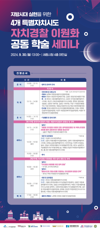 세종시에서 자치경찰 이원화 시범실시와 지방시대 실현을 위한 논의의 장이 열린다. 세종시 자치경찰위원회(위원장 남택화)는 오는 30일 시청 여민실에서 '지방시대 실현을 위한 4개 특별자치시도 자치경찰 이원화 공동학술 세미나'를 개최한다고 24일 밝혔다. 이번 세미나는 자치경찰 이원화 시범실시를 위한 전략과 비전을 공유하기 위해 마련됐다. 자치경찰 이원화는 윤석열 정부의 국정과제 중 하나로, 자치경찰을 국가경찰과 독립적인 조직으로 운영하여 주민 체감도를 높이는 것을 목표로 한다. 세종시, 강원도, 제주도 등은 지난 2022년 10월 이원화 시범실시 대상지로 선정됐다. 이번 학술 세미나는 세종·강원·전북·제주자치경찰위원회, 한국법제연구원, 대전세종연구원, 세종특별자치시 국가균형발전센터, 경찰대학교 자치경찰발전위원회가 공동 주최하며, 세종자치경찰위원회와 한국법제연구원 등이 주관한다. 세미나에서는 세종자치경찰의 방향성과 이원화를 위한 법적 쟁점 및 과제를 중심으로 다양한 논의가 이뤄질 예정이다. 주요 발표 주제는 △세종형 자치경찰 이원화 모형(김흥주 대전세종연구원 책임연구위원) △자치경찰 이원화를 위한 법적 쟁점(이기춘 부산대 교수) △행정수도와 지방시대를 지향하는 자치경찰제 방향과 전략(최지민 한국지방행정연구원 부연구위원)이다. 또한 패널토론에서는 이상훈 대전대 교수를 좌장으로, 김영식 세종자치경찰위원회 위원, 김현미 세종시의회 의원, 류제일 세종시 시민안전실장, 이희택 중도일보 기자 등이 자치경찰의 방향성과 전략에 대해 심도 있는 논의를 펼칠 예정이다. ‘자치경찰 이원화를 위한 법적 쟁점과 과제’에 대한 토론은 유인호 세종시의회 의원을 좌장으로, 고철용 세종국가균형발전지원센터장, 김일순 충청투데이 기자, 박영신 세종시교육청 정책국장 등이 참여하여 열띤 논의를 진행할 계획이다. 세종자치경찰위원회 관계자는 "이번 세미나가 자치경찰 이원화를 위한 초석이 되길 바란다"며 "시민들의 많은 관심과 의견을 기대한다"고 전했다. /배진우 기자 배진우 기자 gogk88@sejongilbo.co.kr 다른기사 보기 저작권자 © 세종일보 무단전재 및 재배포 금지 당신만 안 본 뉴스 한화 불꽃축제 30일 개최…대전시, 방문객 안전 관리 강화 주민이 채우는 폐교, 지역이 키우는 공간으로 만든다 [사설] 일할 세대가 떠난다 ‘APEC 2025 미래들의 수다’, 청년 시선으로 본 인구위기 어린이 환경교육, 뮤지컬로 배우는 탄소중립 외로움 대신 연결로… 청년 위한 온라인 상담 시범 운영 반복되는 SPC 사고… 노동부 "노동강도·건강영향 재진단 필요" 한화 불꽃축제 30일 개최…대전시, 방문객 안전 관리 강화 개의 댓글 회원로그인 작성자 비밀번호 댓글 내용입력 댓글 정렬 최신순 추천순 답글순 BEST댓글 BEST 댓글 답글과 추천수를 합산하여 자동으로 노출됩니다. 닫기 더보기 댓글삭제 삭제한 댓글은 다시 복구할 수 없습니다. 그래도 삭제하시겠습니까? 비밀번호 닫기 댓글수정 댓글 수정은 작성 후 1분내에만 가능합니다. 본문 / 400 비밀번호 닫기 내 댓글 모음 닫기 주요기사