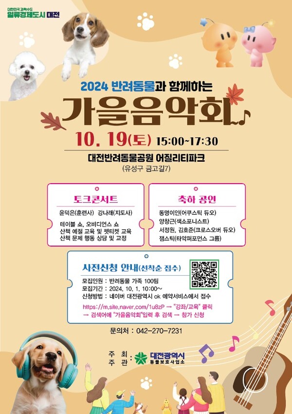 대전동물보호사업소는 오는 10월 19일 대전반려동물공원 어질리티파크에서 반려동물과 함께 즐길 수 있는 ‘반려동물과 함께하는 가을음악회’를 개최한다고 밝혔다. 이번 행사는 반려동물공원 개원 이후 처음으로 열리는 행사로, 대전OK예약서비스를 통해 사전 예약한 반려동물 가족을 대상으로 진행된다. 행사는 오후 3시부터 5시 30분까지 약 2시간 30분 동안 다양한 프로그램으로 꾸며질 예정이다. 1부 토크콘서트에서는 반려동물 훈련사와 지도사가 함께 반려견의 복종훈련, 산책 예절 교육 및 문제 행동 교정 등의 프로그램을 진행하며, 반려견의 펫티켓을 향상시킬 수 있도록 돕는다. 2부에서는 통기타 그룹 '동명이인'의 공연을 시작으로 색소폰 연주, 성악가의 공연, 그리고 타악 퍼포먼스팀 '잼스틱'의 무대로 다채로운 음악을 선사할 계획이다. 참여를 원하는 반려동물 가족은 10월 1일부터 13일까지 대전OK예약서비스를 통해 사전 예약을 할 수 있으며, 관람료는 전석 무료이다. 기타 자세한 사항은 대전동물보호사업소 반려동물과로 문의하면 된다. 박종민 대전동물보호사업소장은 "이번 음악회는 반려동물과 함께 특별한 추억을 쌓을 수 있는 기회"라며, "안전하고 즐거운 시간이 될 수 있도록 철저히 준비하겠다"고 전했다. /이성재 기자