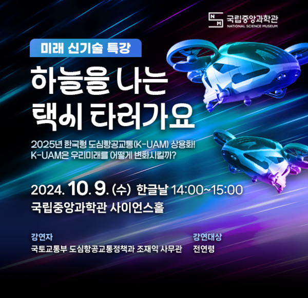국립중앙과학관은 미래사회를 대비한 신기술을 주제로 한 '미래 신기술 특강' 을 10월과 11월 사이언스홀에서 개최한다고 밝혔다. 이번 특강은 국민들에게 최신 기술이 어떻게 미래사회를 변화시킬지에 대한 이해를 높이고, 이에 대응할 역량을 키우기 위해 기획됐다. 특강은 △도심항공교통(K-UAM)과 △자율주행버스를 주제로 두 차례에 걸쳐 진행될 예정이다. 첫 번째 강연은 10월 9일 '하늘을 나는 택시 타러 가요'라는 주제로 열리며, 국토교통부 담당자와 함께 2025년 상용화를 목표로 한 한국형 도심항공교통(K-UAM)의 현황과 최신 기술 동향을 살펴본다. 두 번째 강연은 11월 30일 '운전자 없는 세상'이라는 주제로 진행된다. 세종시에서 운행 중인 자율주행 버스의 자율주행 기술과 현장 실증 과정을 소개하며, 그 속에 담긴 다양한 이야기를 전달할 예정이다. '미래 신기술 특강'에 대한 자세한 내용과 예약 방법은 국립중앙과학관 공식 누리집에서 확인할 수 있다. /이승현 기자