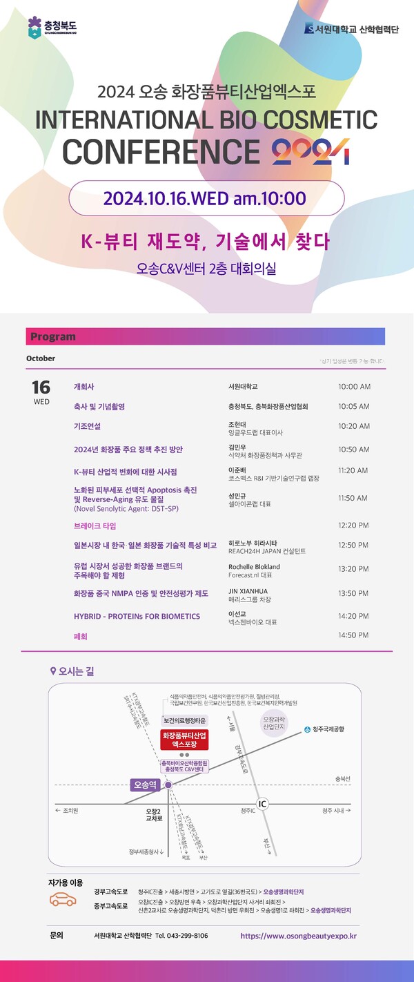 충북도는 K-뷰티 산업의 중심지로 자리매김하기 위해 10월 16일 오송생명과학단지 내 C&V센터 대회의실에서 '제10회 국제 바이오코스메틱 컨퍼런스'를 개최했다. 이번 행사는 2024 오송화장품뷰티산업엑스포의 연계 프로그램으로, 충북도가 주최하고 서원대학교 산학협력단이 주관했으며 국내외 화장품 전문가들이 참여해 총 8개의 세션으로 진행됐다. 올해 컨퍼런스는 충북 도내 기업의 요구를 반영해 급변하는 화장품 시장의 동향과 글로벌 경쟁력을 강화하는 데 중점을 두었다. 특히, 인공 단백질과 펩타이드 기술 등 최신 트렌드를 도내 기업들과 공유하며 혁신적인 제품 개발을 촉진했다. 행사는 조현대 잉글우드랩 대표이사의 세계 화장품 시장 환경에 대한 기조연설로 시작되었으며, 이어서 식품의약품안전처 김민우 사무관이 2024년 화장품 주요 정책 추진 방안을 발표했다. 이후 코스맥스 R&I 연구소의 이준배 소장은 국내 ODM/OEM 산업의 변화와 경쟁력을 논의했으며, 성민규 셀아이콘랩 대표는 인공 단백질과 펩타이드 성분을 활용한 화장품 제조법을 발표했다. 또한 일본, 네덜란드, 중국의 화장품 전문가들이 참여해 각국의 시장 동향과 기술적 특성, 제형 차별화 전략, 해외 시장 진출 시 국내 기업들이 활용할 수 있는 마케팅 전략과 규제에 대한 심도 깊은 논의가 이어졌다. 권영주 충북도 바이오식품의약국장은 "오송화장품뷰티산업엑스포는 K-뷰티의 중심지로서 충북도의 역할을 부각시키는 중요한 행사다"라며 "앞으로도 국제 바이오코스메틱 컨퍼런스를 통해 충북 화장품 산업의 지속 가능한 발전을 도모하겠다"고 밝혔다. /이현정 기자