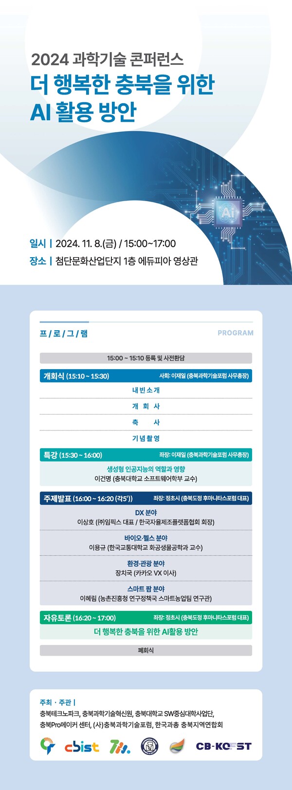 충북도가 (사)충북과학기술포럼과 함께 8일 첨단문화산업단지에서 산·학·연 전문가들이 모인 가운데 '더 행복한 충북을 위한 AI 활용 방안' 콘퍼런스를 개최했다. 이번 행사는 충북 디지털 위크의 일환으로 열렸으며, 충북과기원, 한국과총 충북지역연합회, 충북대 SW중심대학사업단 등 지역 혁신 기관들이 함께 주관했다. 이번 콘퍼런스는 충북 발전을 위해 AI 기술을 다양한 분야에 활용할 수 있는 방안을 모색하고자 마련되었다. 이건명 충북대학교 교수는 '생성형 인공지능의 역할과 영향'을 주제로 특강을 진행, 생성형 AI와 거대 언어 모델의 개념과 이를 통한 변화 대비 방안 등을 설명했다. 이어진 주제 발표와 토론에서는 △디지털 전환(DX) △바이오·헬스 △환경·관광 △스마트팜 등 4개 분야에서 전문가들이 AI 활용 방안을 발표했다. 각각 ㈜임픽스의 이상호 대표, 한국교통대학교 이용규 교수, 카카오VX 장치국 이사, 농촌진흥청 이혜림 연구원이 발표자로 나서 AI 기술의 활용 가능성과 기대 효과를 소개했다. 종합 토론에서는 정초시 충북도정 후마니타스포럼 대표가 좌장을 맡아 AI 기술이 충북의 각 산업에 어떻게 접목될 수 있을지에 대해 심도 있는 논의가 진행되었다. 김수민 충북도 정무부지사는 "AI 기술을 통해 충북의 산업 혁신과 경제 구조의 변화를 이끌어낼 것"이라며 "AI 기술 융합을 통한 미래 성장 동력 창출을 위해 산·학·연 협력을 지속적으로 강화하겠다"고 밝혔다. /이현정 기자