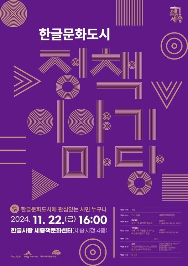 세종시와 세종시문화관광재단은 오는 22일 세종책문화센터에서 '한글문화도시 정책 이야기마당'을 개최한다. 이번 행사는 한강 작가의 노벨문학상 수상 등으로 세계에서 주목받고 있는 K-콘텐츠 수요에 대응하고, 복합문화공간 조성의 필요성과 방향성을 논의하기 위해 마련됐다. 이날 정책 이야기마당은 관련 전문가들의 주제발표와 토론으로 진행될 예정이다. 발표 주제는 △문화산업 집적화의 필요성 △세종시에서 구현될 복합문화공간의 구성 등 두 가지로 구성됐다. 장동석 파주출판문화도시 문화재단 사무처장은 파주출판문화단지 사례를 중심으로 문화산업 집적화의 성공 비결을 소개하고, 단지 내 복합문화공간인 아시아출판문화정보센터의 운영 사례를 발표한다. 김정우 고려대학교 문화콘텐츠학부 교수는 세종시에 적합한 세계적인 복합문화공간 구성 방안을 제안하며, 이를 통해 한글과 한류문화를 효과적으로 연계하고 한국어 학습 수요에 대응할 수 있는 방안을 논의할 예정이다. 일반 시민도 자유롭게 참여할 수 있는 이번 행사에서는 강연 청취와 더불어 현장 의견을 공유할 기회가 주어진다. 최민호 시장은 "한글문화와 산업의 세계화를 위해 집적화된 공간이 필수적이며, 세종시는 세종대왕의 얼과 한글문화 발전의 중심지로서 최적의 장소"라며 "이번 논의의 장이 실현 가능성을 모색하는 계기가 되길 바란다"고 밝혔다. /배진우 기자