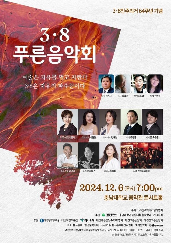 대전시는 3·8민주의거 64주년을 맞아 6일 충남대학교 음악관 콘서트홀에서 '3·8푸른음악회'를 개최한다. 이번 음악회는 3·8민주의거의 정신과 가치를 음악을 통해 알리고, 시민들이 그 의미를 기념할 수 있도록 마련된 특별한 무대이다. 이종희 충남대학교 예술대학 음악학과 명예교수가 작곡과 지휘를 맡고, 실력 있는 성악가들과 클라리넷, 트럼펫 연주, 느루 콘서트 콰이어의 합창이 어우러져 감동적인 공연을 선사할 예정이다. 정진용 3·8민주의거기념관장은 이번 음악회가 3·8민주의거의 자유, 민주, 정의의 가치를 되새기고, 이를 많은 이들이 알게 되는 기회가 되기를 바란다고 밝혔다. /이성재 기자
