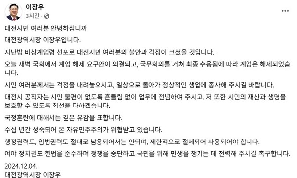 지난밤 비상계엄령이 선포되며 시민들의 불안감이 커진 가운데, 이장우 대전광역시장이 오늘(4일) 새벽 계엄 해제를 알리며 시민들에게 안심할 것을 당부했다. 이 시장은 자신의 페이스북을 통해 “새벽 국회에서 계엄 해제 요구안이 의결되고, 국무회의를 거쳐 최종 수용됐다”며 “시민들께서는 걱정을 내려놓고 일상으로 돌아가 생업에 종사해 달라”고 전했다. 이어 공직자들에게는 시민 불편을 최소화하기 위해 흔들림 없이 업무에 임할 것을 요청하며, 시장으로서도 시민의 안전과 재산 보호에 최선을 다하겠다고 밝혔다. 이 시장은 국정 혼란 상황에 대해 “수십 년간 성숙되어 온 자유민주주의가 위협받고 있다”며 깊은 유감을 표명했다. 그는 “행정권력과 입법권력은 절대로 남용되어서는 안 된다”며 권력 사용의 절제와 여야 정치권의 헌법 준수를 강조했다. 특히, 정쟁을 멈추고 민생 문제 해결에 집중해 줄 것을 촉구했다. 계엄 해제 결정 이후 대전시는 정상적인 행정 운영을 이어가며 시민들의 불편을 줄이기 위한 대응에 나설 예정이다. /이성재 기자
