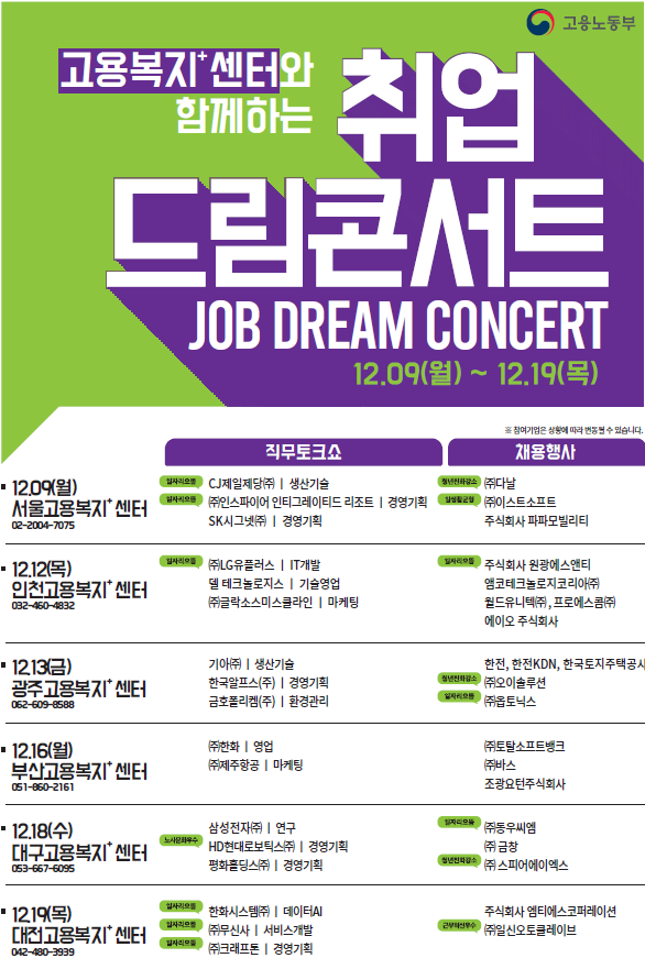고용노동부가 청년 구직자들을 지원하기 위해 특별한 고용 지원 프로그램을 마련했다. 12월 2주부터 3주까지 진행되는 이번 '고용복지+센터 집중 취업·채용지원 기간'은 다양한 취업 지원 행사를 통해 청년들의 일자리 연결을 돕는다. 이번 행사의 핵심은 6개 주요 권역(서울, 부산, 대전 등)에서 열리는 '2025 취업드림 콘서트'다. 이 콘서트는 취업전략특강, 직무토크쇼, 일자리 수요데이 등의 프로그램으로 구성되어 있다. 특강에서는 인공지능(AI) 면접 대비법 등 최신 채용 경향을 다루며, 토크쇼에서는 청년들이 선호하는 우수기업의 현직자들이 멘토로 참여해 취업 팁과 기업 문화를 공유한다. 특히 채용 행사인 일자리 수요데이는 지역 우수기업과 구직자를 연결하는 데 초점을 맞췄다. 행사 참가자들은 채용 면접뿐만 아니라 이력서 작성법과 면접 요령 등 다양한 컨설팅을 받을 수 있으며, AI 모의면접 체험 등도 가능하다. 한편 고용복지+센터는 이번 행사를 계기로 연말까지 70여 차례의 일자리 수요데이를 추가 개최할 예정이다. 이를 통해 청년 구직자들이 자신에게 적합한 일자리를 찾을 기회를 제공한다는 계획이다. 고용노동부는 내년에도 맞춤형 고용서비스를 강화해 청년들의 취업 여정을 적극적으로 지원할 것이라고 밝혔다. 행사에 대한 자세한 정보와 신청 방법은 고용복지+센터 및 주요 채용 플랫폼 누리집을 통해 확인할 수 있다. /이승현 기자
