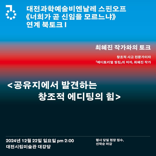 대전시립미술관은 22일 오후 2시 미술관 강당에서 대전과학예술비엔날레의 연계 프로그램인 북토크를 개최한다. 이번 행사에는 '에디토리얼 씽킹'의 저자인 최혜진 작가가 초청되어 창조적 사고를 주제로 심도 있는 대화를 나눌 예정이다. 이를 통해 새로운 아이디어와 가능성을 발견하는 방법을 공유할 기회를 제공한다. 북토크는 누구나 참여 가능하며 참가비는 무료다. 입장은 선착순으로 진행되며, 별도로 전시 관람 시 유료 관람료가 적용된다. 대전시립미술관 관계자는 이번 북토크 프로그램이 과학과 예술을 연결하는 창의적 상상력을 발현하는 계기가 될 것으로 기대한다고 밝혔다. 한편, 대전과학예술비엔날레는 내년 2월 2일까지 대전시립미술관, 대전창작센터, 구석으로부터, 공간오십오 등에서 개최되며, 대전시립미술관을 제외한 나머지 장소는 무료로 관람할 수 있다. /이승현 기자