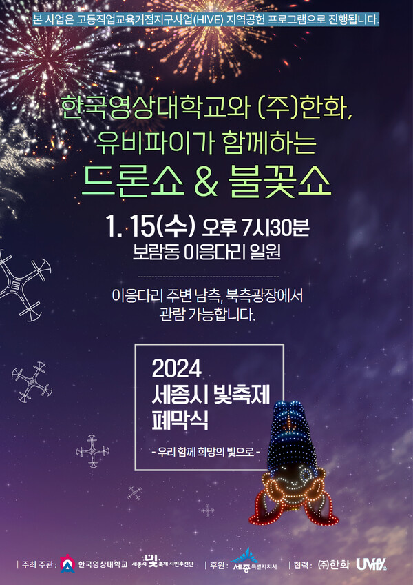 2024 세종시 빛축제가 34일간의 일정을 마무리하며 오는 15일 폐막식을 개최한다. 폐막식은 오후 7시 30분부터 이응다리 남측 광장에서 열리며, 한국영상대학교의 교육부 고등직업교육거점지구(HIVE) 지역공헌 프로그램의 일환으로 진행된다. 폐막식에 앞서 탭댄스와 시니어 모델 패션쇼가 사전 행사로 준비되었으며, 퓨전국악밴드 고니아의 축하 공연도 예정되어 있다. 특히 제주항공 참사로 인해 취소되었던 드론쇼와 불꽃쇼가 유비파이와 한화의 협력을 통해 이번 폐막식에서 재개된다. 겨울 하늘을 수놓을 이 공연은 축제의 대미를 장식할 예정이다. 세종시 빛축제는 시의회의 예산 삭감으로 인해 무산될 위기에 놓였으나, 시민들이 자발적으로 '세종시 빛축제 시민추진단'을 구성하며 다시 추진되었다. 지난 10월 30일 발족식을 시작으로 짧은 준비 기간에도 불구하고 철저한 기획을 통해 진행되었다. 축제 기간 동안 개막식과 크리스마스 전야 행사를 포함한 다양한 프로그램이 시민과 관광객을 끌어모았고, 세종시의 대표 겨울 축제로 자리 잡는 데 크게 기여했다는 평가를 받고 있다. 임인택 시민추진단 상임대표는 "시민의 힘으로 만들어낸 이번 축제는 세종 시민의 성숙한 시민 의식이 가능케 했다"며 "빛축제가 세종 사랑 원년의 해에 마중물이 되길 희망한다"고 말했다. 한편, 폐막식을 위해 이응다리는 14일 오전 10시부터 15일 오후 9시까지 전면 통제된다. 또한, 남부경찰서 회전교차로부터 세무서 삼거리까지의 도로는 15일 오후 7시부터 9시까지 차량 통행이 제한된다. /배진우 기자