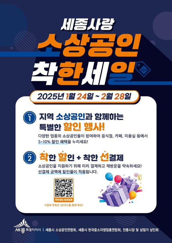 세종시는 지역 소상공인들과 함께 경제 불황을 극복하기 위한 내수 진작에 나선다. 오는 24일부터 내달 28일까지 '세종사랑 소상공인 착한세일'이 개최된다. 이번 행사는 소상공인들이 주도하며, 세종시 전역에서 80여 개 업체가 자발적으로 참여한다. 행사 기간 동안에는 매장별로 다양한 할인 혜택이 제공되며, 추가적인 참여 업체도 모집할 예정이다. 참여 업체에서는 음식점, 카페, 생활체육, 미용 등 다양한 업종에서 할인 혜택을 제공하며, 평균 5∼10% 이상의 할인이 적용된다. 할인 정보는 세종시 누리집 또는 각 매장에 비치된 QR코드를 통해 확인할 수 있다. 이번 행사와 병행하여 ‘착한 선결제’ 캠페인도 진행된다. 이 캠페인은 시민들이 미리 결제하고 재방문을 약속하는 방식으로, 본청을 비롯한 시 산하기관, 중앙부처 및 공공기관에서 적극적인 참여를 유도할 계획이다. 또한, 올해 800억 원 규모의 소상공인 자금이 지원되며, 시중은행에서는 가산금리를 낮춰 대출금리를 최대 0.7% 인하하고, 대출금리 1.75~2.0%에 해당하는 이자 차액을 보전한다. 세종시는 전통시장과 상점가의 활성화를 위해 시청 구내식당의 정기 휴무일에 ‘찾아가는 구내식당’을 운영하며, 전통시장에서의 소비 촉진을 목표로 한다. 또한, 국가공공기관과 국책연구기관에는 경영평가 지표에 반영되는 ‘지역농산물 구매실적’을 전통시장에서의 구매로 이어지도록 홍보할 예정이다. 이승원 경제부시장은 "이번 내수 진작 방안이 소비자와 판매자 간의 상생 문화를 확산시키는 좋은 모델이 될 것"이라며 "행정기관과 시민들이 적극적으로 동참하면 지역 경제에 큰 활력을 불어넣을 것"이라고 말했다. /배진우 기자 배진우 기자 gogk88@sejongilbo.co.kr 다른기사 보기 저작권자 © 세종일보 무단전재 및 재배포 금지 당신만 안 본 뉴스 한화 불꽃축제 30일 개최…대전시, 방문객 안전 관리 강화 주민이 채우는 폐교, 지역이 키우는 공간으로 만든다 [사설] 일할 세대가 떠난다 ‘APEC 2025 미래들의 수다’, 청년 시선으로 본 인구위기 어린이 환경교육, 뮤지컬로 배우는 탄소중립 외로움 대신 연결로… 청년 위한 온라인 상담 시범 운영 반복되는 SPC 사고… 노동부 "노동강도·건강영향 재진단 필요" 한화 불꽃축제 30일 개최…대전시, 방문객 안전 관리 강화 개의 댓글 회원로그인 작성자 비밀번호 댓글 내용입력 댓글 정렬 최신순 추천순 답글순 BEST댓글 BEST 댓글 답글과 추천수를 합산하여 자동으로 노출됩니다. 닫기 더보기 댓글삭제 삭제한 댓글은 다시 복구할 수 없습니다. 그래도 삭제하시겠습니까? 비밀번호 닫기 댓글수정 댓글 수정은 작성 후 1분내에만 가능합니다. 본문 / 400 비밀번호 닫기 내 댓글 모음 닫기 주요기사