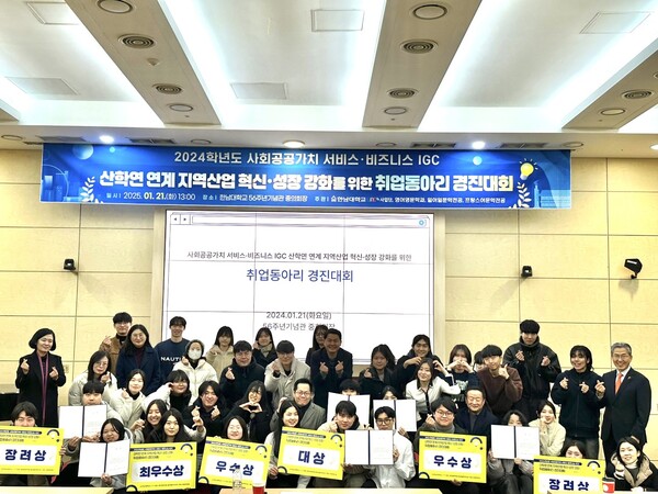 한남대학교 영어영문학과, 일어일문학전공, 프랑스어문학전공이 LINC 3.0 사업단의 후원으로 취업동아리 경진대회를 개최했다. 지난 21일 열린 '사회공공가치 서비스·비즈니스 IGC 산학연 연계 지역산업 혁신·성장 강화를 위한 취업동아리 경진대회'는 지역사회, 공공기관, 산업체와의 연계를 통해 인문학 전공자들이 학문적 지식을 현장에 적용할 수 있는 실천의 장이 됐다. 이번 경진대회에는 총 9개 학과에서 56명이 참여했으며, 대상은 외국인 유학생의 취업 및 정주 여건 개선 방안을 제시한 '코리안 드림' 팀이 차지했다. 최우수상은 대전 지역 관광 콘텐츠의 개선점을 발굴하고 아이디어를 제시한 'CL' 팀에게 돌아갔다. 경진대회와 함께 지역 산업체 전문가인 ㈜나노하이테크 김병순 대표이사를 초청해 '나의 미래 방향은'이라는 주제로 특강이 진행됐다. 김병순 대표이사는 특강에서 성공적인 취업 및 창업 활동은 개인의 노력뿐만 아니라 주변 사람들과의 관계 형성이 중요한 역할을 한다고 강조했다. 취업동아리 활동을 총괄한 영어영문학과 이용철 교수는 "앞으로도 지역 산업체와 유기적인 협력 체계를 구축하여 산학연 활동을 강화하고, 학생들이 산업 현장을 경험할 수 있는 환경을 마련할 계획"이라고 밝혔다. /이성재 기자