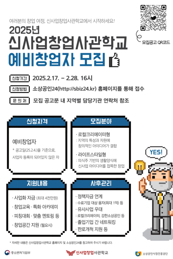 세종특별자치시(시장 최민호)가 17일부터 28일까지 세종창조경제혁신센터에서 운영하는 '2025년 신사업창업사관학교'에 참가할 지역 예비창업자를 모집한다. 신사업창업사관학교는 생활·서비스 영역의 혁신 아이디어나 고유 기술·비결을 기반으로 창업을 준비하는 예비창업자를 발굴해 역량 강화 교육과 사업화 자금을 지원하는 사업이다. 올해는 창업 트렌드와 지역 경제 활성화 등을 고려해 '로컬크리에이터', '라이프스타일 혁신' 등 두 개 분야로 특화해 총 20명의 예비창업자를 선발할 예정이다. 선발된 교육생은 교육 프로그램, 피칭 대회, 특강 등 다양한 역량 강화 교육을 통해 창업 아이템을 구체화할 기회를 얻는다. 또한, 서류 및 발표 심사를 거쳐 최대 4,000만 원의 사업화 자금을 차등 지원받을 수 있다. 신사업창업사관학교 졸업 후에는 정책자금(최대 1억 원), 매칭융자(최대 5억 원) 등 추가 자금 지원이 연계된다. 이외에도 소상공인시장진흥단의 로컬크리에이터 육성사업, 특허청 아이피(IP) 창출 종합 패키지 지원사업 신청 시 우대 혜택이 주어진다. 세종창조경제혁신센터는 신사업창업사관학교를 운영한 지난 3년간 총 58명의 창업자를 배출했으며, 2년 연속 주관기관 '최우수' 등급을 받았다. 신청을 원하는 예비창업자는 소상공인24를 통해 접수할 수 있으며, 사업설명회는 11~ 20일 온·오프라인으로 진행된다. 자세한 사항은 세종창조경제혁신센터 창업지원팀으로 문의하면 된다. /배진우 기자 배진우 기자 gogk88@sejongilbo.co.kr 다른기사 보기 저작권자 © 세종일보 무단전재 및 재배포 금지 당신만 안 본 뉴스 한화 불꽃축제 30일 개최…대전시, 방문객 안전 관리 강화 주민이 채우는 폐교, 지역이 키우는 공간으로 만든다 [사설] 일할 세대가 떠난다 ‘APEC 2025 미래들의 수다’, 청년 시선으로 본 인구위기 어린이 환경교육, 뮤지컬로 배우는 탄소중립 외로움 대신 연결로… 청년 위한 온라인 상담 시범 운영 반복되는 SPC 사고… 노동부 "노동강도·건강영향 재진단 필요" 한화 불꽃축제 30일 개최…대전시, 방문객 안전 관리 강화 개의 댓글 회원로그인 작성자 비밀번호 댓글 내용입력 댓글 정렬 최신순 추천순 답글순 BEST댓글 BEST 댓글 답글과 추천수를 합산하여 자동으로 노출됩니다. 닫기 더보기 댓글삭제 삭제한 댓글은 다시 복구할 수 없습니다. 그래도 삭제하시겠습니까? 비밀번호 닫기 댓글수정 댓글 수정은 작성 후 1분내에만 가능합니다. 본문 / 400 비밀번호 닫기 내 댓글 모음 닫기 주요기사