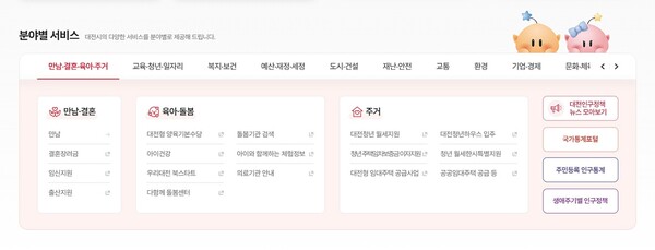 대전시는 17일부터 청장년층과 MZ세대를 대상으로 '만남·결혼·육아·주거 분야별 통합서비스'를 운영한다. 이번 서비스는 저출생 문제에 대응하기 위한 핵심 인구정책을 통합적으로 제공하는 플랫폼으로, 만남부터 결혼, 임신, 출산, 육아, 주거까지 생애주기별 지원 정보를 한곳에서 확인할 수 있도록 구축됐다. 특히 청장년층이 체감할 수 있는 정책을 강화하기 위해 신규 발굴된 사업이라는 점에서 의미가 크다. 시 균형발전과와 정보화정책과 등 5개국 7개 부서가 협업해 제작해 완성도를 높였다. 통합서비스는 대전시 누리집(웹사이트) 메인 화면을 통해 제공되며, 대전시 및 정부가 운영하는 청장년층·신혼부부 대상 핵심 공공서비스를 한곳에서 확인할 수 있다. 일부 사업은 신청 링크를 함께 제공해 서비스 이용 편의성을 높였다. 주요 서비스로는 △만남 △결혼 △임신 △출산 △육아·돌봄 △주거 등 6개 분야에서 17개 핵심 지원사업을 포함하며, △인구정책 뉴스 모아보기 △생애주기별 인구정책 안내 기능 등을 강화해 시민들이 자신의 삶의 단계에 맞는 정책을 효과적으로 활용할 수 있도록 했다. 이장우 대전시장은 "대전시는 청장년층이 꿈을 꾸고 가정을 꾸릴 수 있도록 촘촘한 지원 정책을 펼치고 있다"며 "이번 통합서비스가 시민들에게 실질적인 도움이 되길 기대하며, 대전에서 희망찬 미래를 설계할 수 있도록 시정 역량을 집중할 것"이라고 밝혔다. /이성재 기자 이성재 기자 a1065@sejongilbo.co.kr 다른기사 보기 저작권자 © 세종일보 무단전재 및 재배포 금지 당신만 안 본 뉴스 한화 불꽃축제 30일 개최…대전시, 방문객 안전 관리 강화 주민이 채우는 폐교, 지역이 키우는 공간으로 만든다 [사설] 일할 세대가 떠난다 ‘APEC 2025 미래들의 수다’, 청년 시선으로 본 인구위기 어린이 환경교육, 뮤지컬로 배우는 탄소중립 외로움 대신 연결로… 청년 위한 온라인 상담 시범 운영 반복되는 SPC 사고… 노동부 "노동강도·건강영향 재진단 필요" 한화 불꽃축제 30일 개최…대전시, 방문객 안전 관리 강화 개의 댓글 회원로그인 작성자 비밀번호 댓글 내용입력 댓글 정렬 최신순 추천순 답글순 BEST댓글 BEST 댓글 답글과 추천수를 합산하여 자동으로 노출됩니다. 닫기 더보기 댓글삭제 삭제한 댓글은 다시 복구할 수 없습니다. 그래도 삭제하시겠습니까? 비밀번호 닫기 댓글수정 댓글 수정은 작성 후 1분내에만 가능합니다. 본문 / 400 비밀번호 닫기 내 댓글 모음 닫기 주요기사