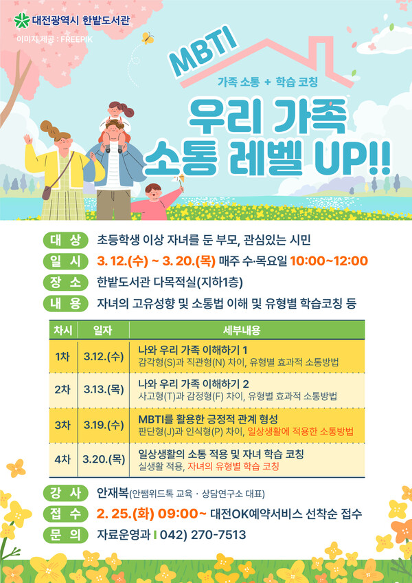 대전 한밭도서관이 부모와 자녀 간 소통을 강화하고 맞춤형 학습 코칭을 지원하는 'MBTI 우리 가족 소통 레벨UP!!' 프로그램을 운영한다. 이번 프로그램은 MBTI 성격 유형 검사를 활용해 부모가 자녀의 성향을 이해하고, 효과적인 대화법과 학습 지도 방법을 익힐 수 있도록 기획됐다. 참가자들은 MBTI를 통해 자기 자신과 가족의 성향을 탐색하고, 이를 기반으로 긍정적인 관계를 형성하는 방법을 배우게 된다. 또한 자녀의 고유 성향을 고려한 맞춤형 학습 코칭 과정도 포함된다. 모집 대상은 초등학생 자녀를 둔 부모와 관심 있는 시민 30명이며, 프로그램은 3월 12일부터 3월 20일까지 매주 수요일과 목요일 총 4회에 걸쳐 진행된다. 참가 신청은 25일 오전 9시부터 대전시 OK예약서비스를 통해 선착순으로 접수할 수 있다. 김혜정 한밭도서관 관장은 "MBTI를 활용해 자녀의 성향을 이해하고 효과적인 대화법을 익혀 가족 간 유대감을 강화할 수 있기를 바란다"며 "자녀 교육에서 소통이 중요한 요소인 만큼, 많은 시민이 참여해 유익한 시간이 되길 기대한다"고 밝혔다. 자세한 사항은 한밭도서관 홈페이지 또는 대전시 예약서비스에서 확인할 수 있으며, 문의는 한밭도서관 자료운영과로 하면 된다. /이승현 기자