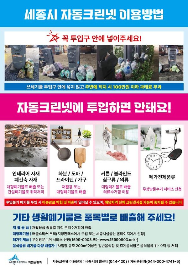 세종시는 오는 17일부터 28일까지 공동주택과 상가 등을 대상으로 생활폐기물 불법배출 근절을 위한 집중 단속을 실시한다고 밝혔다. 이번 단속은 자동크린넷에 대형폐기물인 이불, 장판, 베개, 쿠션 등을 무단 투입하는 행위를 집중 점검하기 위한 것으로, 이로 인해 발생하는 수거관로의 막힘 현상이 빈번해지고 있다. 수거관로의 막힘으로 공동주택 내 생활폐기물 수거가 지연되며 폐기물 적치와 악취 등 시민 불편이 계속되고 있다. 시는 자동크린넷에 대형폐기물을 무단 투입하거나 종량제봉투를 사용하지 않거나 재활용 가능 자원을 혼합배출하는 등의 폐기물관리법 위반 사항을 집중적으로 단속한다. 위반자가 적발되면 폐기물관리법에 따라 100만 원 이하의 과태료가 부과된다. 시는 또한 시민들을 대상으로 올바른 생활폐기물 배출 방법을 홍보할 계획이다. 진익호 자원순환과장은 "자동크린넷은 생활폐기물 배출자가 올바르게 사용하고 관리해야 하는 시설"이라며 "쾌적한 생활환경을 위해 시민들의 적극적인 관심과 동참을 부탁드린다"고 말했다. /배진우 기자