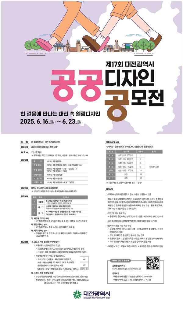 대전시는 시민 참여를 통해 도시 디자인 수준을 높이고자 제17회 공공디자인 공모전을 개최한다. 이번 공모전은 '한걸음에 만나는 대전 속 힐링 디자인'을 주제로 하며, 시설물디자인, 공간디자인, 시각디자인 등 세 개 분야에서 창의적인 작품을 모집한다. 시설물디자인 분야에서는 둔산대공원(한밭수목원) 특화 디자인을, 공간디자인 분야에서는 소제동 카페거리 일원 공간디자인을 지정 과제로 설정했다. 시각디자인 분야는 도시브랜드 자산을 활용한 홍보용 기념품 디자인과 공공디자인 공모전 BI 디자인을 주제로 한다. 작품 접수는 6월 16일부터 23일까지 공모전 홈페이지를 통해 진행된다. 심사를 거쳐 7월 중 수상작이 발표되며, 대상 수상자에게는 500만 원을 포함해 총 1,700만 원 규모의 상금이 지급된다. 수상작은 작품집으로 제작되며 전시회도 개최될 예정이다. 자세한 사항은 공모전 홈페이지에서 확인할 수 있으며, 문의는 대전시 명품디자인담당관에서 받는다. /이성재 기자 이성재 기자 a1065@sejongilbo.co.kr 다른기사 보기 저작권자 © 세종일보 무단전재 및 재배포 금지 당신만 안 본 뉴스 한화 불꽃축제 30일 개최…대전시, 방문객 안전 관리 강화 주민이 채우는 폐교, 지역이 키우는 공간으로 만든다 [사설] 일할 세대가 떠난다 ‘APEC 2025 미래들의 수다’, 청년 시선으로 본 인구위기 어린이 환경교육, 뮤지컬로 배우는 탄소중립 외로움 대신 연결로… 청년 위한 온라인 상담 시범 운영 반복되는 SPC 사고… 노동부 "노동강도·건강영향 재진단 필요" 한화 불꽃축제 30일 개최…대전시, 방문객 안전 관리 강화 개의 댓글 회원로그인 작성자 비밀번호 댓글 내용입력 댓글 정렬 최신순 추천순 답글순 BEST댓글 BEST 댓글 답글과 추천수를 합산하여 자동으로 노출됩니다. 닫기 더보기 댓글삭제 삭제한 댓글은 다시 복구할 수 없습니다. 그래도 삭제하시겠습니까? 비밀번호 닫기 댓글수정 댓글 수정은 작성 후 1분내에만 가능합니다. 본문 / 400 비밀번호 닫기 내 댓글 모음 닫기 주요기사