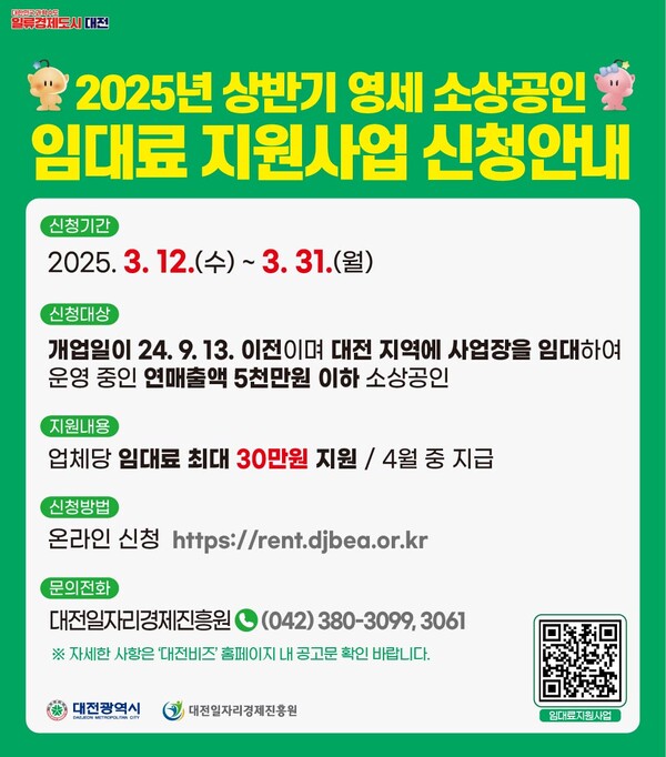 대전시가 소상공인의 경영 부담 완화를 위해 임대료 지원을 확대한다. 지난해 16억 원이었던 예산을 올해 34억 원으로 두 배 증액해 총 1만개 업체를 대상으로 지원할 계획이다. 대전시는 지난해 5,063개 업체에 업체당 30만 원씩 총 16억 원을 지급한 바 있다. 올해는 지원 대상을 확대해 상반기와 하반기 두 차례에 걸쳐 임대료를 지원한다. 상반기 신청은 3월 12일부터 3월 31일까지 온라인으로 진행되며, 지원 대상은 공고일 기준 6개월 이상 대전에서 사업장을 운영 중인 연 매출 5천만 원 이하 소상공인이다. 신청자 중 적격 여부를 심사한 후 연 매출이 적은 순으로 4월 중 최대 30만 원이 지급된다. 하반기 신청은 8월경 진행될 예정이며, 상반기 접수 및 지원 현황을 반영해 기준이 일부 조정될 수 있다. 상반기에 지원받은 소상공인도 중복 신청이 가능하다. 자세한 내용은 대전시 중소기업지원 포털 대전비즈에서 확인할 수 있으며, 온라인 접수 방법 및 기타 사항은 대전일자리경제진흥원에서 안내받을 수 있다. /이성재 기자 이성재 기자 a1065@sejongilbo.co.kr 다른기사 보기 저작권자 © 세종일보 무단전재 및 재배포 금지 당신만 안 본 뉴스 한화 불꽃축제 30일 개최…대전시, 방문객 안전 관리 강화 주민이 채우는 폐교, 지역이 키우는 공간으로 만든다 [사설] 일할 세대가 떠난다 ‘APEC 2025 미래들의 수다’, 청년 시선으로 본 인구위기 어린이 환경교육, 뮤지컬로 배우는 탄소중립 외로움 대신 연결로… 청년 위한 온라인 상담 시범 운영 반복되는 SPC 사고… 노동부 "노동강도·건강영향 재진단 필요" 한화 불꽃축제 30일 개최…대전시, 방문객 안전 관리 강화 개의 댓글 회원로그인 작성자 비밀번호 댓글 내용입력 댓글 정렬 최신순 추천순 답글순 BEST댓글 BEST 댓글 답글과 추천수를 합산하여 자동으로 노출됩니다. 닫기 더보기 댓글삭제 삭제한 댓글은 다시 복구할 수 없습니다. 그래도 삭제하시겠습니까? 비밀번호 닫기 댓글수정 댓글 수정은 작성 후 1분내에만 가능합니다. 본문 / 400 비밀번호 닫기 내 댓글 모음 닫기 주요기사