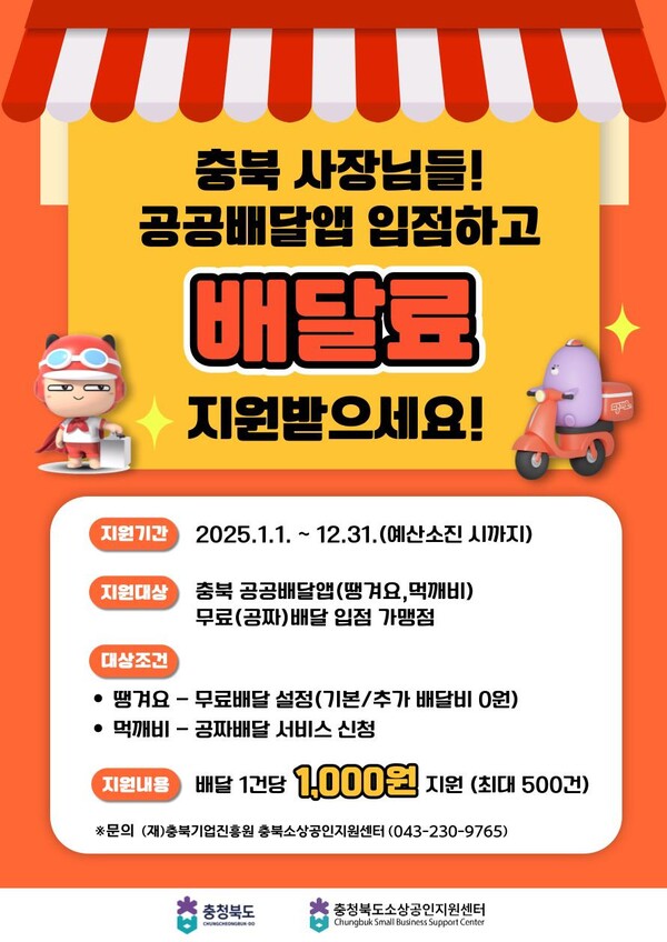 충북도가 소상공인 외식업 경영 부담을 완화하기 위해 공공배달앱을 통한 배달비 지원에 나선다. 충북도는 '소상공인 외식서비스 지원사업'을 통해 공공배달앱 '땡겨요'와 '먹깨비'에 입점한 도내 외식업 소상공인에게 배달비를 지원한다고 밝혔다. 이번 지원은 내수 소비심리 위축과 민간 배달앱의 독과점 심화로 어려움을 겪는 소상공인에게 실질적인 도움이 될 것으로 기대된다. 지원 대상은 '땡겨요'와 '먹깨비'의 무료배달 서비스를 이용하는 가맹점이며, 공공배달앱을 통해 발생한 주문 건당 1000원씩 월별 정산해 다음 달 가맹점주에게 지급한다. 가맹점주 1인당 최대 50만원까지 지원하며, 예산 소진 시까지 사업이 운영된다. 충북도는 배달비 지원을 통해 공공배달앱 가맹점을 확대하고 소비자의 선택 폭을 넓히는 선순환 구조를 구축한다는 계획이다. 이를 통해 지역 소상공인의 경영 안정을 도모하는 동시에 공공배달앱 활성화로 지역 경제와 민생경제에 긍정적인 영향을 미칠 것으로 예상된다. 사업 신청 및 세부 사항은 충북소상공인지원센터를 통해 확인할 수 있다. /이현정 기자 이현정 기자 lhj@sejongilbo.co.kr 다른기사 보기 저작권자 © 세종일보 무단전재 및 재배포 금지 당신만 안 본 뉴스 한화 불꽃축제 30일 개최…대전시, 방문객 안전 관리 강화 주민이 채우는 폐교, 지역이 키우는 공간으로 만든다 [사설] 일할 세대가 떠난다 ‘APEC 2025 미래들의 수다’, 청년 시선으로 본 인구위기 어린이 환경교육, 뮤지컬로 배우는 탄소중립 외로움 대신 연결로… 청년 위한 온라인 상담 시범 운영 반복되는 SPC 사고… 노동부 "노동강도·건강영향 재진단 필요" 한화 불꽃축제 30일 개최…대전시, 방문객 안전 관리 강화 개의 댓글 회원로그인 작성자 비밀번호 댓글 내용입력 댓글 정렬 최신순 추천순 답글순 BEST댓글 BEST 댓글 답글과 추천수를 합산하여 자동으로 노출됩니다. 닫기 더보기 댓글삭제 삭제한 댓글은 다시 복구할 수 없습니다. 그래도 삭제하시겠습니까? 비밀번호 닫기 댓글수정 댓글 수정은 작성 후 1분내에만 가능합니다. 본문 / 400 비밀번호 닫기 내 댓글 모음 닫기 주요기사