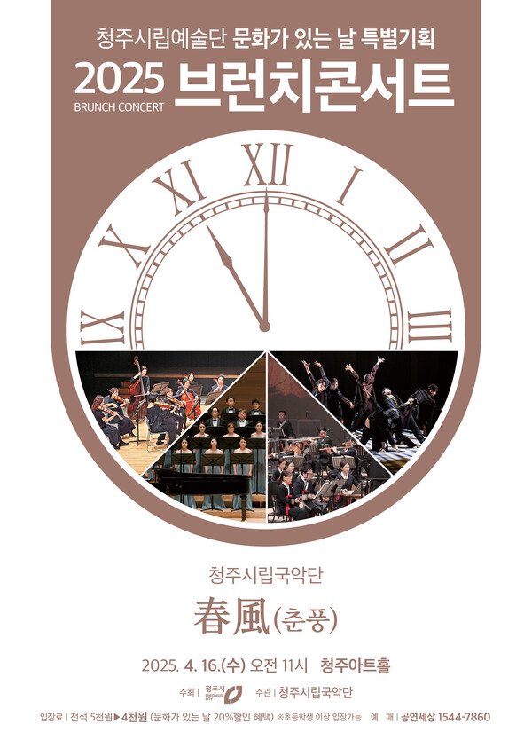 청주시립국악단(예술감독 겸 상임지휘자 김원선)이 4월 브런치콘서트 '春風(춘풍)' 티켓 예매를 19일 오후 2시부터 시작한다. 전통 국악과 현대적 감각이 어우러진 이번 공연은 무병장수를 기원하는 정악 '천년만세'로 시작해 관악합주 '대풍류'로 이어진다. 지난 2월 위촉된 가야금, 해금, 피리, 타악 등 신규 단원 5명이 중심이 되는 무대도 마련됐다. 퓨전밴드 소리창조 예화의 특별 무대도 포함된다. 2013년 창단된 소리창조 예화는 클래식과 컨템포러리 문화를 접목한 음악을 선보여 왔으며, 이번 공연에서는 '고향의 봄'과 '사철가'를 독창적인 스타일로 편곡해 연주한다. 마지막 무대는 박경훈 작곡의 '네잎클로버'와 이지영 작곡의 '너와 나의 아름다운 동행' 등 실내악 연주로 마무리된다. 공연은 4월 16일 청주아트홀에서 열린다. 티켓 가격은 전석 4천 원이며, 공연세상을 통해 예매할 수 있다. 잔여석에 한해 당일 현장 구매도 가능하다. /이현정 기자