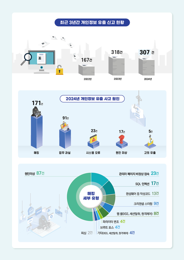 개인정보보호위원회와 한국인터넷진흥원이 2024년 개인정보 유출 신고 동향을 분석한 결과, 지난해 접수된 유출 신고는 총 307건으로 집계됐다. 이는 전년도 318건과 유사한 수준으로, 원인별로는 해킹이 56%(171건)로 가장 많았고, 업무 과실 30%(91건), 시스템 오류 7%(23건) 순이었다. 해킹으로 인한 유출 건수는 전년 151건에서 171건으로 증가한 반면, 업무 과실(116건→91건)과 시스템 오류(29건→23건)는 감소했다. 해킹 유형별로는 관리자 페이지 비정상 접속(23건), SQL 인젝션(17건), 악성 코드(13건), 크리덴셜 스터핑(9건) 등이 주요 원인으로 나타났다. 불법적인 접근이 있었으나 구체적인 원인이 확인되지 않은 사건도 87건에 달했다. SQL 인젝션은 공격자가 악의적인 SQL 문을 삽입해 데이터베이스를 조작하는 방식이며, 크리덴셜 스터핑은 유출된 계정 정보를 활용해 다른 웹사이트에서도 무차별 로그인 시도를 하는 기법이다. 업무 과실로 인한 유출 사례는 주로 게시판·단체채팅방에 개인정보 파일 게시(27건), 이메일 동보 발송(10건), 이메일·공문에 개인정보 파일 오첨부(7건) 등이었다. 시스템 오류로 인한 유출은 소스코드 적용 오류(14건), API 연동 오류(8건) 등이 주요 원인으로 지목됐다. 기관 유형별로 보면, 공공기관의 개인정보 유출 신고는 104건으로 전체의 34%를 차지했다. 전년도 41건과 비교하면 2배 이상 증가한 수치로, 2023년 9월 개인정보 보호법 개정으로 공공기관의 유출 신고 기준이 강화된 영향으로 분석된다. 개정 이전에는 유출 규모가 1,000명 이상일 때만 신고하도록 했으나, 개정 이후에는 민감 정보 또는 고유식별정보가 1건이라도 유출될 경우 신고 대상이 된다. 공공기관별로는 중앙행정기관·지방자치단체(42%), 대학교·교육청(41%), 공공기관·특수법인(17%) 순이었다. 민간기업의 신고 건수는 203건으로 전체의 66%를 차지했으나, 전년도 277건보다 감소했다. 기관 유형별로는 중소기업(60%), 해외사업자(12%), 협단체(12%), 중견기업(11%), 대기업(5%) 순으로 나타났다. 개인정보위는 보고서를 통해 해킹 공격에 대한 보안 조치 강화를 강조했다. 크리덴셜 스터핑을 방지하기 위해서는 비정상적인 로그인 시도를 탐지·차단하고, 자동입력 방지코드(CAPTCHA) 도입, 문자메시지·이메일 인증 추가 적용 등의 대책이 필요하다고 밝혔다. 또한, SQL 인젝션 차단을 위해 시큐어 코딩 적용, 취약점 점검·조치, 웹 방화벽(WAF) 운영 등의 보호 조치를 마련해야 한다고 설명했다. 업무 과실로 인한 유출을 예방하기 위해서는 게시판·홈페이지에 자료 업로드 시 개인정보 포함 여부를 사전에 확인하고, 이메일 발송 시 개인별 발송 기능을 기본값으로 설정해야 한다고 밝혔다. 아울러, 개인정보가 저장된 업무용 기기의 경우 기기 비밀번호 설정 및 파일 암호화 조치를 시행하고, 원격제어 기능을 활용한 데이터 초기화 등의 조치도 필요하다고 강조했다. 개인정보위와 한국인터넷진흥원은 이번 보고서를 기관과 기업에 제공해 개인정보 보호 체계 강화를 위한 교육 및 점검 자료로 활용할 계획이다. /이현정 기자