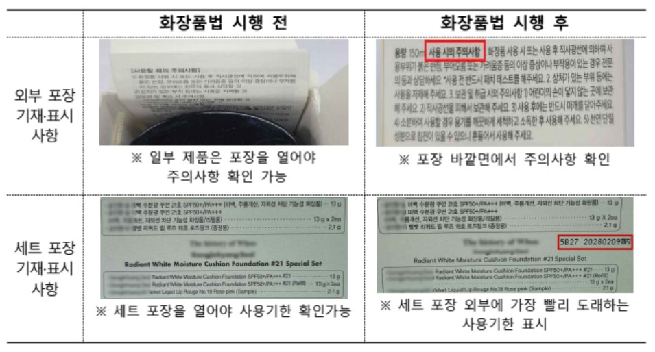 식품의약품안전처는 화장품법 개정에 따라 변경된 화장품 기재·표시 사항이 적용된 제품이 유통되고 있다고 밝혔다. 이번 개정은 소비자가 화장품을 보다 안전하게 사용할 수 있도록 정보를 명확하게 제공하는 데 목적이 있다. 올해 2월부터 시행된 개정 화장품법에 따라 화장품의 명칭, 영업자 상호·주소, 성분, 용량·중량, 사용기한, 가격, 주의사항 등 주요 정보를 포장이나 용기의 외부에서 확인할 수 있도록 표시해야 한다. 이에 따라 소비자는 제품을 개봉하지 않고도 필수 정보를 확인할 수 있어 구매 편의성이 증대될 것으로 예상된다. 또한, 여러 화장품을 묶어 포장한 세트 제품의 경우 가장 빠른 사용기한 한 개만 외부에 표시할 수 있도록 허용됐다. 이를 통해 산업계의 표시 부담을 완화하면서도 소비자가 사용기한을 직관적으로 확인할 수 있도록 했다. 한편, 염모제·탈염·탈색제·제모제 등 포장에 모든 주의사항을 기재하기 어려운 제품의 경우, 주요 주의사항을 첨부문서로 제공할 수 있도록 했다. 해당 제품을 사용하는 소비자는 부작용을 방지하기 위해 반드시 첨부문서를 확인해야 한다. 식품의약품안전처는 앞으로도 화장품 표시 제도를 지속적으로 개선해 소비자의 안전한 제품 사용을 도모할 방침이다. /이현정 기자 이현정 기자 lhj@sejongilbo.co.kr 다른기사 보기 저작권자 © 세종일보 무단전재 및 재배포 금지 당신만 안 본 뉴스 한화 불꽃축제 30일 개최…대전시, 방문객 안전 관리 강화 주민이 채우는 폐교, 지역이 키우는 공간으로 만든다 [사설] 일할 세대가 떠난다 ‘APEC 2025 미래들의 수다’, 청년 시선으로 본 인구위기 어린이 환경교육, 뮤지컬로 배우는 탄소중립 외로움 대신 연결로… 청년 위한 온라인 상담 시범 운영 반복되는 SPC 사고… 노동부 "노동강도·건강영향 재진단 필요" 한화 불꽃축제 30일 개최…대전시, 방문객 안전 관리 강화 개의 댓글 회원로그인 작성자 비밀번호 댓글 내용입력 댓글 정렬 최신순 추천순 답글순 BEST댓글 BEST 댓글 답글과 추천수를 합산하여 자동으로 노출됩니다. 닫기 더보기 댓글삭제 삭제한 댓글은 다시 복구할 수 없습니다. 그래도 삭제하시겠습니까? 비밀번호 닫기 댓글수정 댓글 수정은 작성 후 1분내에만 가능합니다. 본문 / 400 비밀번호 닫기 내 댓글 모음 닫기 주요기사