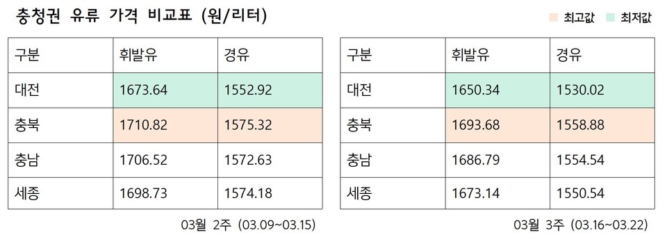 관련기사 충청권 유류 가격 조정... 소비자 부담 완화 국제유가·환율 영향? 충청권 경유 가격↑·휘발유 안정세 충청권 휘발유·경유 가격 전국 평균 웃돌아 충청권 유가 하락세…휘발유·경유 가격 모두 내려 최대 100원 차이… 4월 1주차 충청권 유가 비교해보니