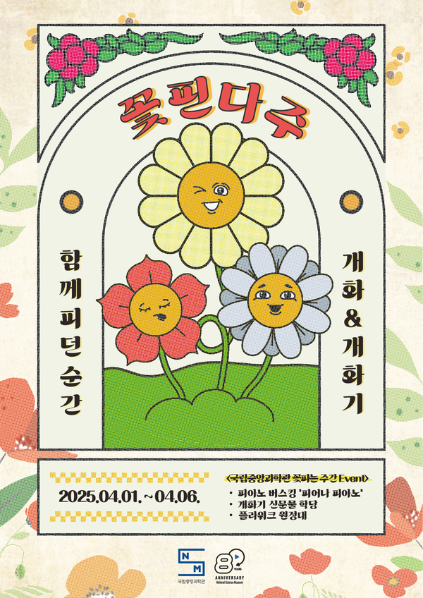 국립중앙과학관은 4월 1일부터 4월 6일까지 일주일 간 ‘꽃핀다주’ 문화행사를 개최한다. 대전 유성구 탄동천변과 한국과학기술원 일대에서 벚꽃, 매화, 살구꽃이 만개하는 봄철을 맞아 다양한 프로그램이 마련됐다. 이번 행사는 ‘함께 피는 순간, 개화&개화기’라는 주제로 봄 식물의 개화와 과학의 개화기를 연결한 내용으로 구성된다. ‘피어나 피아노’는 벚꽃이 만개한 성두산과 나로호를 배경으로 한 피아노 거리공연(버스킹)이다. 프로연주자, 대회 우승자, 작곡가, 피아노 취미자들이 참여해 공연을 펼친다. 공연 일정은 과학관 홈페이지와 SNS를 통해 공개될 예정이다. 4월 6일에는 국립중앙과학관에서 ‘개화기 신문물 학당’이라는 연찬회가 진행된다. 이 행사는 개화기 과학기술자료를 직접 관찰하고 작동해 보는 워크샵으로, 전북대 김연희 교수의 강의와 함께 세계적 시계 제작자 현광훈 작가, 축음기 전문가 전미영 대표와 최완규 관장이 함께 진행한다. 또한, ‘플라워크 원정대’라는 프로그램도 열린다. 관람객들은 꽃길을 걸으며 쪽지를 찾아 임무를 완수하고, 그 결과로 즉석에서 꽃다발을 만들어보는 게임에 참여할 수 있다. 국립중앙과학관 권석민 관장은 "겨우 내 에너지를 비축했다 꽃망울을 터트리는 식물처럼 우리나라의 과학발전도 그러하였다"며 "꽃핀다주 기간 동안 자연, 사람, 문화가 함께 피어나는 과학관이 되길 기대한다"고 밝혔다. /이승현 기자