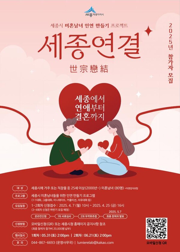 세종특시가 7일부터 25일까지 미혼남녀의 만남을 지원하는 '세종연결' 행사 참가자를 모집한다. 세종시에 거주하거나 직장을 둔 미혼남녀를 대상으로 진행되며, 연애와 결혼을 희망하는 이들에게 교류와 소통의 기회를 제공하는 자리다. 세종시는 2015년 지방자치단체 최초로 미혼남녀 만남행사를 추진한 이후 코로나 시기를 제외하고 매년 행사를 개최해왔다. 지난해에는 2회에 걸쳐 총 80명을 모집했으며, 326명이 신청할 정도로 높은 관심을 받았다. 올해는 모집 인원을 160명으로 확대하고, 행사 횟수도 부대행사 2회를 포함해 총 6회로 늘린다. 세종청년센터와 협력해 진행하며, 보다 다양한 만남의 기회를 제공할 예정이다. 특히 단오(양력 5월 31일), 하지(양력 6월 21일), 칠석(양력 8월 29일) 등 전통적인 의미를 지닌 날에 행사를 개최해 특별한 경험을 제공할 계획이다. 또한 지역상권 활성화를 위해 행사 장소는 상가 카페 등 유휴공간과 문화시설을 활용하며, 참가자들이 편안한 분위기에서 자연스럽게 대화를 나눌 수 있도록 조성한다. 참가자 지원 프로그램도 마련됐다. 첫 만남 이후의 고민이나 갈등을 해결할 수 있도록 안심 상담사를 위촉하고, 결혼 준비와 관련된 정책 안내를 단계별로 지원하는 원스톱 서비스도 운영한다. 상반기 행사는 5월 31일과 6월 21일 두 차례 진행되며, 세종시에 거주하거나 직장을 둔 25세 이상 미혼남녀 각 40명씩 총 80명을 모집한다. 신청은 7일부터 25일까지 네이버폼 QR코드 또는 바로가기 주소(https://naver.me/Fw7Rq0qh)를 통해 가능하다. 신청자는 거주지와 나이 등을 확인하는 서류 심사를 거친 뒤 무작위 추첨을 통해 최종 선정된다. 하반기 참가자 모집은 7월 중 진행되며, 행사에 대한 자세한 사항은 '세종연결' 운영사무국으로 문의하면 된다. 세종시는 더 많은 미혼남녀에게 기회를 제공하기 위해 민관협력을 확대할 방침이며, 참여를 희망하는 민간기업과 단체는 세종시청 인구여성가족과로 문의하면 된다. /배진우 기자