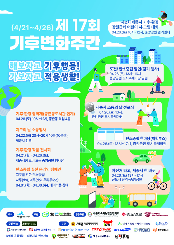 세종시가 제55주년 지구의 날을 맞아 4월 21일부터 26일까지 ‘제17회 기후변화주간 행사’를 연다. 올해 주제는 ‘해보자고 기후행동! 가보자고 적응생활!’로, 시민들의 일상 속 탄소중립 실천을 유도하는 다양한 프로그램이 준비됐다. 이번 기후변화주간에는 △지구의 날 소등행사 △탄소중립 한마당 △기후·환경 어린이 시·그림대회 △환경 작품 전시 △온라인 탄소중립 캠페인 등이 진행된다. 지구의 날인 22일에는 시청을 포함한 공공기관과 공동주택, 한두리대교 등 주요 다리, 관내 대학교 기숙사 등에서 오후 8시부터 10분간 소등 행사가 열린다. 시민들도 가정과 상가에서 자율적으로 참여할 수 있다. 시는 이를 계기로 매달 22일을 ‘소등의 날’로 지정하고 매월 오후 8시 10분간 소등 캠페인을 실시할 계획이다. 기후변화주간의 핵심 행사인 ‘탄소중립 한마당’은 26일 오후 1시부터 5시까지 세종중앙공원 도시축제마당 잔디광장에서 열린다. 세종기후·환경네트워크가 주관하며, 시민들이 탄소중립을 보다 친숙하게 접할 수 있도록 ‘도전! 탄소중립 달인’, ‘소등의 날 선포 퍼포먼스’, 체험 부스 등이 운영된다. ‘도전! 탄소중립 달인’ 참여는 시 누리집 공지사항을 통해 사전 신청하거나, 행사 당일 현장 QR코드를 통해 가능하다. 이 밖에도 어린이 대상 기후·환경 시·그림 대회와 기후환경 작품 전시, 온라인 캠페인 등이 함께 진행되며, 생활 속 탄소 저감을 위한 시민 참여를 유도할 방침이다. /배진우 기자 배진우 기자 gogk88@sejongilbo.co.kr 다른기사 보기 저작권자 © 세종일보 무단전재 및 재배포 금지 당신만 안 본 뉴스 한화 불꽃축제 30일 개최…대전시, 방문객 안전 관리 강화 주민이 채우는 폐교, 지역이 키우는 공간으로 만든다 [사설] 일할 세대가 떠난다 ‘APEC 2025 미래들의 수다’, 청년 시선으로 본 인구위기 어린이 환경교육, 뮤지컬로 배우는 탄소중립 외로움 대신 연결로… 청년 위한 온라인 상담 시범 운영 반복되는 SPC 사고… 노동부 "노동강도·건강영향 재진단 필요" 한화 불꽃축제 30일 개최…대전시, 방문객 안전 관리 강화 개의 댓글 회원로그인 작성자 비밀번호 댓글 내용입력 댓글 정렬 최신순 추천순 답글순 BEST댓글 BEST 댓글 답글과 추천수를 합산하여 자동으로 노출됩니다. 닫기 더보기 댓글삭제 삭제한 댓글은 다시 복구할 수 없습니다. 그래도 삭제하시겠습니까? 비밀번호 닫기 댓글수정 댓글 수정은 작성 후 1분내에만 가능합니다. 본문 / 400 비밀번호 닫기 내 댓글 모음 닫기 주요기사
