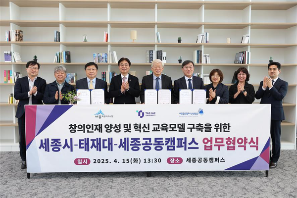 김형렬 행복청장이 4월 15일 세종공동캠퍼스에서 열린 ‘창의인재 양성과 교육모델 구축을 위한 업무협약식’에 참석했다. 이번 협약은 세종공동캠퍼스운영법인과 태재대학교, 세종시가 공동으로 체결했다. 김 청장은 축사에서 태재대가 세종시를 거점으로 혁신 교육프로그램을 운영할 수 있도록 공동캠퍼스와 인근 국책연구기관 등을 적극 활용해 지원할 계획이라고 밝혔다. 또한 태재대가 세종과 국가 발전을 위한 창의적 인재를 양성해줄 것을 당부했다. 태재대학교는 2023년 개교한 4년제 사이버대학으로, 온라인 교육플랫폼과 함께 서울·도쿄·뉴욕·홍콩·모스크바에 오프라인 캠퍼스를 운영하는 하이브리드형 교육 모델을 갖추고 있다. 이번 협약을 통해 세종시를 기반으로 도시문제 해결 프로젝트를 발굴하고, 세종공동캠퍼스 입주 대학들과 교류프로그램을 운영하는 등 현장 중심의 학사 운영 방안을 추진할 계획이다. /배진우 기자