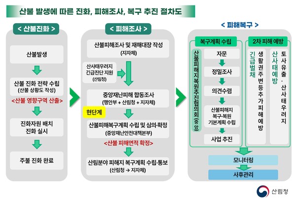 경북·경남·울산 지역에서 발생한 대형 산불의 산림 피해 면적이 잠정 104천ha로 집계됐다. 산림청은 정밀 현장조사 결과를 바탕으로 이 같은 피해 규모를 발표하며, 최종 피해 면적은 중앙재난안전대책본부에서 확정할 예정이라고 밝혔다. 산불 피해 조사는 지자체가 1차 조사를 지난 3월 28일부터 4월 8일까지 실시한 뒤, 중앙재난피해합동조사단이 4월 9일부터 15일까지 지자체와 함께 2차 현장 확인을 진행하는 방식으로 이뤄졌다. 이번 산불의 경우 강한 바람을 타고 비화가 확산되며 피해 지역이 급격히 넓어졌고, 산불 진화 이후 열에 의한 추가 고사까지 발생하면서 피해 면적이 증가한 것으로 분석됐다. 지역별 잠정 피해 면적은 △경북 99,289ha(의성 28,853ha, 안동 26,709ha, 청송 20,655ha, 영양 6,864ha, 영덕 16,208ha), △경남 3,397ha(산청 2,403ha, 하동 994ha), △울산(울주) 1,190ha다. 산불 진화 당시 파악된 산불영향구역은 48천ha였으나, 이는 진화 전략 수립을 위한 헬기·드론 영상, 지상관측을 토대로 화선 경계를 표시한 구역으로, 복구를 위한 실제 피해 면적과는 산정 방식과 활용 목적이 다르다. 특히 이번 산불은 순간최대풍속 27m/s 이상의 태풍급 돌풍이 불어 강한 바람에 불길이 빠르게 지나간 지역은 화선이 형성되지 않아 영향구역에 포함되지 않았고, 강풍과 연무로 인해 화선 관측 장비 운용에도 어려움이 있었다는 설명이다. 산림청은 향후 유사한 초대형 산불에 대비해 고정익 항공기, 중·고고도 드론, 위성 영상 등을 활용한 2중·3중 화선 관측 체계를 관계부처와 협의해 구축할 계획이다. 이와 함께 산림청은 산불로 인한 산사태, 토사유출 등 2차 피해 우려가 있는 4,207개소에 대해 3월 28일부터 4월 11일까지 긴급 진단을 완료했다. 해당 지역에는 응급 복구를 시행하고, 생활권과 주요 시설물 주변의 피해목을 우선 제거할 방침이다. 복구 방식은 피해 정도에 따라 자연복원, 생태복원, 조림복원 등으로 구분해 적용하며, 생태계 건강성을 회복하고 임업인의 소득기반 재건도 병행할 계획이다. /이현정 기자 이현정 기자 lhj@sejongilbo.co.kr 다른기사 보기 저작권자 © 세종일보 무단전재 및 재배포 금지 당신만 안 본 뉴스 한화 불꽃축제 30일 개최…대전시, 방문객 안전 관리 강화 주민이 채우는 폐교, 지역이 키우는 공간으로 만든다 [사설] 일할 세대가 떠난다 ‘APEC 2025 미래들의 수다’, 청년 시선으로 본 인구위기 어린이 환경교육, 뮤지컬로 배우는 탄소중립 외로움 대신 연결로… 청년 위한 온라인 상담 시범 운영 반복되는 SPC 사고… 노동부 "노동강도·건강영향 재진단 필요" 한화 불꽃축제 30일 개최…대전시, 방문객 안전 관리 강화 개의 댓글 회원로그인 작성자 비밀번호 댓글 내용입력 댓글 정렬 최신순 추천순 답글순 BEST댓글 BEST 댓글 답글과 추천수를 합산하여 자동으로 노출됩니다. 닫기 더보기 댓글삭제 삭제한 댓글은 다시 복구할 수 없습니다. 그래도 삭제하시겠습니까? 비밀번호 닫기 댓글수정 댓글 수정은 작성 후 1분내에만 가능합니다. 본문 / 400 비밀번호 닫기 내 댓글 모음 닫기 주요기사