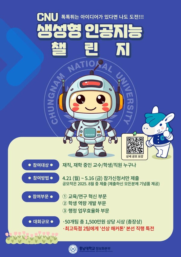 충남대학교가 교육, 연구, 행정 전 분야의 AI 전환을 본격화하는 가운데, 대학 전 구성원을 대상으로 ‘CNU 생성형 인공지능 챌린지’를 개최한다. 이번 챌린지는 정보화본부 주관으로 진행되며, 참가 신청은 4월 21일부터 5월 16일까지 받는다. ‘CNU 생성형 인공지능 챌린지’는 △교육·연구 혁신 △학생 역량 개발 △행정 업무 효율화 등 세 개 부문에서 생성형 AI를 활용한 창의적인 아이디어를 공모하는 방식으로 진행된다. 충남대에 재직 또는 재학 중인 교수, 직원, 학생이라면 누구나 1인 또는 4인 이하 팀을 구성해 참여할 수 있다. 제출된 아이디어는 창의성, 실현 가능성, 완성도 등을 기준으로 평가하며, 총 50개 수상팀을 선정할 계획이다. 1등과 2등 수상팀에게는 마이크로소프트와 함께하는 ‘2025년 선상 해커톤’ 본선 진출 기회가 주어진다. 참가자에게는 온라인 AI 교육 콘텐츠, 커뮤니티 플랫폼 등 다양한 지원 프로그램도 제공되며, 공모전 자체가 AI 실전 학습의 장이 될 것으로 기대된다. 참가 신청과 자세한 정보는 챌린지 홈페이지서 확인할 수 있으며, 문의는 정보화본부로 하면 된다. 충남대는 총장 직속 자문기구인 ‘인공지능혁신위원회’를 출범시키고 ‘CNU AI 대전환’을 본격화하고 있다. 지난 4월 14일에는 국가거점국립대학교 최초로 AI 기반 학사·행정 챗봇 ‘AI 차차’ 서비스를 도입하는 등 AI 기반 스마트 캠퍼스 구현에 속도를 내고 있다. /이성재 기자 이성재 기자 a1065@sejongilbo.co.kr 다른기사 보기 저작권자 © 세종일보 무단전재 및 재배포 금지 당신만 안 본 뉴스 한화 불꽃축제 30일 개최…대전시, 방문객 안전 관리 강화 주민이 채우는 폐교, 지역이 키우는 공간으로 만든다 [사설] 일할 세대가 떠난다 ‘APEC 2025 미래들의 수다’, 청년 시선으로 본 인구위기 어린이 환경교육, 뮤지컬로 배우는 탄소중립 외로움 대신 연결로… 청년 위한 온라인 상담 시범 운영 반복되는 SPC 사고… 노동부 "노동강도·건강영향 재진단 필요" 한화 불꽃축제 30일 개최…대전시, 방문객 안전 관리 강화 개의 댓글 회원로그인 작성자 비밀번호 댓글 내용입력 댓글 정렬 최신순 추천순 답글순 BEST댓글 BEST 댓글 답글과 추천수를 합산하여 자동으로 노출됩니다. 닫기 더보기 댓글삭제 삭제한 댓글은 다시 복구할 수 없습니다. 그래도 삭제하시겠습니까? 비밀번호 닫기 댓글수정 댓글 수정은 작성 후 1분내에만 가능합니다. 본문 / 400 비밀번호 닫기 내 댓글 모음 닫기 주요기사