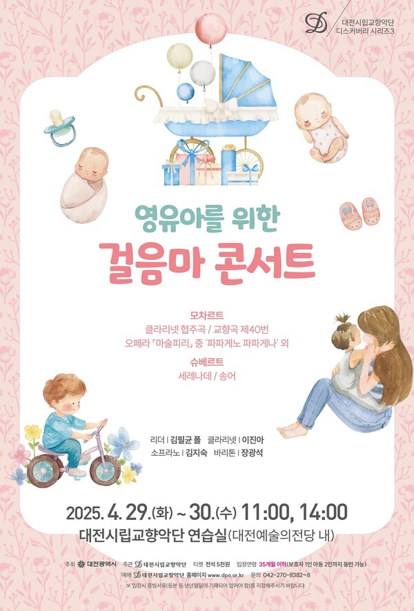 대전시립교향악단이 35개월 이하 영유아와 양육자를 위한 '걸음마 콘서트'를 오는 4월 29일부터 30일까지 대전예술의전당 내 시립교향악단 연습실에서 총 4회 개최한다. 올해 처음 선보이는 이번 공연은 클래식 입문의 의미를 담아 영유아와 양육자가 편안하고 자유로운 분위기에서 음악을 즐길 수 있도록 기획됐다. 객석 대신 바닥에 푹신한 매트를 설치해 아이들이 자유롭게 움직이고 누울 수 있는 환경을 조성했으며, '울어도 괜찮아', '움직여도 괜찮아'라는 배려 문구를 통해 관람의 자유로움을 강조했다. 또한 유모차 주차 공간, 기저귀 교체 공간, 간이침대 등 편의시설을 마련해 관객들의 불편을 최소화했다. 공연은 모차르트의 교향곡과 클라리넷 협주곡, 오페라 아리아와 슈베르트의 '세레나데', '송어' 등 다양한 무대로 구성됐다. 규칙적이고 조화로운 멜로디로 알려진 모차르트 음악은 영유아의 정서적 안정에 도움을 주고 양육자에게 일상에서 벗어난 휴식을 선사할 것으로 기대된다. 김필균 폴 악장이 리더를 맡아 연주회를 이끌며, 클라리넷 수석 이진아와 대전시립청소년합창단 전임지휘자인 바리톤 장광석, 트레이너로 활동 중인 소프라노 김지숙이 협연한다. 공연 티켓은 전석 5천원이며, 예매는 공연 전일 오후 5시까지 대전시립교향악단 홈페이지에서 가능하다. 자세한 사항은 대전시립교향악단 홈페이지를 참고하거나 전화로 문의하면 된다. /이성재 기자