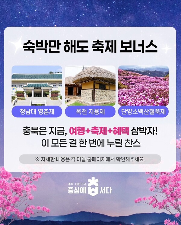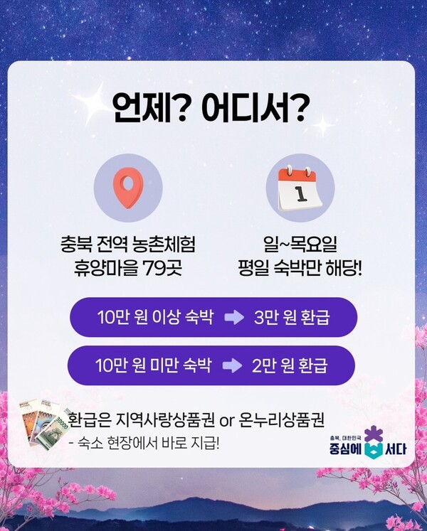 충북도는 봄철 관광 성수기를 맞아 농촌관광 활성화와 지역 내 소비 촉진을 위한 '2025년 농촌체험휴양마을 체류형 관광 활성화 지원사업'을 본격 추진한다고 밝혔다. 도는 도내 농촌체험휴양마을 79개소를 대상으로, 평일(일요일부터 목요일까지) 숙박한 관광객에게 숙박료 일부를 지역사랑상품권 또는 온누리상품권으로 환급한다. 환급 금액은 숙박료 10만 원 이상일 경우 3만 원, 10만 원 미만일 경우 2만 원으로 책정됐으며, 상품권은 마을에서 사전 구매해 숙박 시 현장에서 직접 제공한다. 이번 지원은 충북을 찾는 도시민이 지역 축제와 행사를 체험하며 장기간 체류할 수 있도록 유도하고, 지역경제 활성화로도 이어질 수 있다는 점에서 의미가 있다. 도는 특히 청남대 영춘제, 옥천 지용제, 단양 소백산 철쭉제 등 봄철 주요 지역 행사 기간 중 숙박 수요 증가와 함께 사업 효과가 극대화될 것으로 기대하고 있다. 강찬식 도 농업정책과장은 "이번 지원을 통해 농촌체험휴양마을의 소득 증대는 물론, 지역 전통시장과 소상공인의 매출 확대도 기대된다"며, "도민과 관광객 모두가 만족할 수 있는 지속 가능한 농촌 체류 관광 기반을 조성해 나가겠다"고 밝혔다. /이현정 기자 이현정 기자 lhj@sejongilbo.co.kr 다른기사 보기 저작권자 © 세종일보 무단전재 및 재배포 금지 당신만 안 본 뉴스 한화 불꽃축제 30일 개최…대전시, 방문객 안전 관리 강화 주민이 채우는 폐교, 지역이 키우는 공간으로 만든다 [사설] 일할 세대가 떠난다 ‘APEC 2025 미래들의 수다’, 청년 시선으로 본 인구위기 어린이 환경교육, 뮤지컬로 배우는 탄소중립 외로움 대신 연결로… 청년 위한 온라인 상담 시범 운영 반복되는 SPC 사고… 노동부 "노동강도·건강영향 재진단 필요" 한화 불꽃축제 30일 개최…대전시, 방문객 안전 관리 강화 개의 댓글 회원로그인 작성자 비밀번호 댓글 내용입력 댓글 정렬 최신순 추천순 답글순 BEST댓글 BEST 댓글 답글과 추천수를 합산하여 자동으로 노출됩니다. 닫기 더보기 댓글삭제 삭제한 댓글은 다시 복구할 수 없습니다. 그래도 삭제하시겠습니까? 비밀번호 닫기 댓글수정 댓글 수정은 작성 후 1분내에만 가능합니다. 본문 / 400 비밀번호 닫기 내 댓글 모음 닫기 주요기사