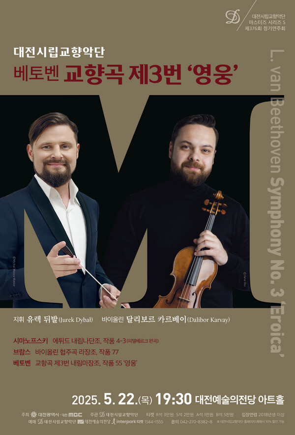 대전시립교향악단은 오는 22일 대전예술의전당 아트홀에서 2025년 마스터즈 시리즈 V의 일환으로 베토벤의 교향곡 제3번 '영웅'을 선보인다. 이번 공연은 폴란드 출신의 세계적인 지휘자 유렉 뒤발이 지휘를 맡고, 빈 심포니 오케스트라의 악장이자 바이올리니스트인 달리보르 카르베이가 협연자로 나서 관객들에게 기대감을 안겨주고 있다. 공연은 시마노프스키의 '에튀드 내림 나단조'로 시작되며, 피텔베르크의 편곡을 통해 오케스트라의 다채로운 색채와 서정적인 선율을 선사한다. 이어 브람스의 '바이올린 협주곡 라장조'에서는 달리보르 카르베이가 협연하며 낭만주의 협주곡의 정수를 선보인다. 후반부에서는 베토벤의 교향곡 제3번 '영웅'이 장엄한 피날레를 장식한다. 이 작품은 베토벤이 원래 나폴레옹에게 헌정하려 했으나, 그의 황제 즉위에 실망하여 무명의 '영웅'에게 헌정한 기념비적인 교향곡으로, 여전히 깊은 감동을 주는 작품으로 널리 알려져 있다. 공연 예매는 대전시립교향악단 홈페이지, 대전예술의전당 홈페이지 및 NOL 티켓을 통해 가능하며, 자세한 사항은 대전시립교향악단 홈페이지나 전화로 문의하면 된다. /이성재 기자