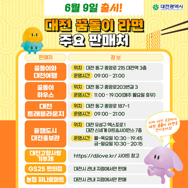 대전시가 지역 대표 캐릭터 '꿈돌이'를 활용한 '대전 꿈돌이 라면'을 6월 9일 정식 출시한다. 출시를 기념해 대전시는 5월 26일부터 6월 6일까지 공식 SNS 계정에서 이름 맞히기 이벤트를 진행한다. 참여자 가운데 100명을 추첨해 5000원 상당의 모바일 쿠폰을 지급하며, 당첨자는 출시일 당일 발표된다. 꿈돌이 라면은 쇠고기맛과 해물짬뽕맛 등 2종으로 구성됐으며, 대전역 3층 '꿈돌이와 대전여행' 매장을 비롯해 꿈돌이하우스, 트래블라운지, 신세계백화점 대전홍보관, GS25, 농협 하나로마트 등에서 판매될 예정이다. 대전고향사랑기부제 온라인몰에서도 구매가 가능하다. 이 제품은 국내 최초로 지역 캐릭터를 적용한 라면 굿즈로, 대전시와 대전관광공사, 민간업체가 협업해 개발했다. 지난해부터 추진해 온 '대전 꿈씨 캐릭터 굿즈 활성화 사업'의 일환으로, 지역 정체성과 관광 이미지를 담아낸 상품이다. /이성재 기자