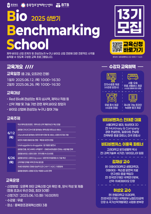 충북도는 12일 청주시에서 2025년 상반기 바이오 창업 아카데미의 첫 교육과정인 바이오벤치마킹스쿨 13기를 개최했다고 밝혔다. 이번 교육은 제약·의료기기 분야 창업을 준비하는 예비 창업자와 바이오 기업 관계자, 투자자, 학생 등 100여 명이 참석해 높은 관심을 보였다. 바이오 창업 아카데미는 충청북도가 주최하고 충북창조경제혁신센터가 주관하는 바이오 전문 창업 교육 프로그램으로, 상·하반기 각 4회씩 운영되며 바이오벤치마킹스쿨과 메드텍스쿨로 구성된다. 바이오벤치마킹스쿨은 제약 바이오 산업 분야에서 실질적인 창업 인사이트를 제공하는 데 중점을 두고 있으며, 이번 13기 1차 교육에서는 국내 제약산업 트렌드, 글로벌 아웃소싱 전략, 유전자 치료 기술의 변화, 암 치료 기술의 진화 등을 주제로 전문가 강의가 진행됐다. 2차 교육은 오는 6월 26일 열릴 예정이며, 글로벌 바이오 시장 전망, 사업개발 전략, 신약개발 단계별 연구개발 자금 로드맵, 주요 다국적 제약사 전략 분석 등 보다 심화된 내용이 다뤄질 예정이다. 의료기기 분야 예비 창업자를 위한 메드텍스쿨은 6월 20일과 27일 양일간 개최된다. 이번 9기 교육은 AI 소프트웨어 기반 디지털 의료제품과 조직수복용생체재료인 필러를 중심으로 인허가 제도, GMP 운영 사례, 기술문서 작성, 보험등재, 글로벌 진출 전략 등 의료기기 사업화에 필요한 전주기 실무 교육으로 구성된다. 참가 신청은 충북창조경제혁신센터 홈페이지를 통해 6월 17일까지 가능하다. 충북도는 아카데미 수료 기업을 대상으로 후속 엑셀러레이팅 프로그램을 연계하고, 지역 내 정착과 지속 가능한 성장을 도울 수 있도록 체계적인 지원을 이어갈 방침이다. /이현정 기자 이현정 기자 lhj@sejongilbo.co.kr 다른기사 보기 저작권자 © 세종일보 무단전재 및 재배포 금지 당신만 안 본 뉴스 한화 불꽃축제 30일 개최…대전시, 방문객 안전 관리 강화 주민이 채우는 폐교, 지역이 키우는 공간으로 만든다 [사설] 일할 세대가 떠난다 ‘APEC 2025 미래들의 수다’, 청년 시선으로 본 인구위기 어린이 환경교육, 뮤지컬로 배우는 탄소중립 외로움 대신 연결로… 청년 위한 온라인 상담 시범 운영 반복되는 SPC 사고… 노동부 "노동강도·건강영향 재진단 필요" 한화 불꽃축제 30일 개최…대전시, 방문객 안전 관리 강화 개의 댓글 회원로그인 작성자 비밀번호 댓글 내용입력 댓글 정렬 최신순 추천순 답글순 BEST댓글 BEST 댓글 답글과 추천수를 합산하여 자동으로 노출됩니다. 닫기 더보기 댓글삭제 삭제한 댓글은 다시 복구할 수 없습니다. 그래도 삭제하시겠습니까? 비밀번호 닫기 댓글수정 댓글 수정은 작성 후 1분내에만 가능합니다. 본문 / 400 비밀번호 닫기 내 댓글 모음 닫기 주요기사