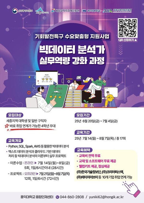 세종시가 기회발전특구 내 입주 기업의 인력 수요에 대응하기 위해 맞춤형 인재 양성에 나선다. 세종시는 산업통상자원부 '기회발전특구 수요맞춤형 지원사업' 공모에 선정됨에 따라, 첫 신규 인력 양성 프로그램으로 '빅데이터 분석가 실무역량 강화 과정'을 개설하고 오는 7월 4일까지 교육생을 모집한다고 26일 밝혔다. 이번 교육은 인공지능, 빅데이터, 클라우드 컴퓨팅 등 4차 산업혁명 핵심기술과 소프트웨어 사물인터넷 융합 역량을 갖춘 실무형 인재를 양성하는 데 중점을 둔다. 교육은 7월 14일부터 8월 7일까지 총 100시간 동안 진행되며, 이론과 실습을 병행해 현장 적용 능력을 높일 수 있도록 구성됐다. 교육비와 교재, 소프트웨어는 전액 무료로 제공되며, 환영물품과 중식도 지원된다. 교육 수료자에게는 특구 내 입주 기업인 ㈜한국정보기술단, ㈜코리아퍼스텍, ㈜에이치이브이 등 10개 기업과의 취업 연계 기회가 주어진다. 신청 대상은 세종지역 대학생 및 일반 구직자이며, 바로 취업이 가능한 대학 4학년은 우대된다. 접수는 구글폼을 통해 온라인으로 진행되며, 선발 인원은 총 15명이다. 시는 앞서 이달 초 재직자를 대상으로 '로봇운영체제 로봇프로그래밍 실무능력 향상과정'을 개설한 데 이어, 올해 10월까지 재직자 70명, 신규 인력 30명 등 총 100명을 대상으로 특구 맞춤형 교육과정을 운영할 계획이다. 김현기 세종시 경제산업국장은 "이번 교육은 지역 인재들이 빅데이터 분야에서 경쟁력을 확보하는 계기가 될 것"이라며 "청년 일자리 창출과 지역경제 활성화를 위한 지원을 지속해 나가겠다"고 말했다. /배진우 기자 배진우 기자 gogk88@sejongilbo.co.kr 다른기사 보기 저작권자 © 세종일보 무단전재 및 재배포 금지 당신만 안 본 뉴스 한화 불꽃축제 30일 개최…대전시, 방문객 안전 관리 강화 주민이 채우는 폐교, 지역이 키우는 공간으로 만든다 [사설] 일할 세대가 떠난다 ‘APEC 2025 미래들의 수다’, 청년 시선으로 본 인구위기 어린이 환경교육, 뮤지컬로 배우는 탄소중립 외로움 대신 연결로… 청년 위한 온라인 상담 시범 운영 반복되는 SPC 사고… 노동부 "노동강도·건강영향 재진단 필요" 한화 불꽃축제 30일 개최…대전시, 방문객 안전 관리 강화 개의 댓글 회원로그인 작성자 비밀번호 댓글 내용입력 댓글 정렬 최신순 추천순 답글순 BEST댓글 BEST 댓글 답글과 추천수를 합산하여 자동으로 노출됩니다. 닫기 더보기 댓글삭제 삭제한 댓글은 다시 복구할 수 없습니다. 그래도 삭제하시겠습니까? 비밀번호 닫기 댓글수정 댓글 수정은 작성 후 1분내에만 가능합니다. 본문 / 400 비밀번호 닫기 내 댓글 모음 닫기 주요기사