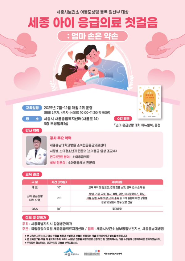 세종시가 예비 부모의 육아 역량 강화를 위해 영유아 응급상황 대처 교육 '엄마 손은 약손'을 7월부터 12월까지 정기적으로 운영한다. 교육 대상은 세종시 보건소에 등록된 임산부이며, 참가 모집은 개별 문자 메시지를 통해 안내된다. 이번 교육은 영유아 발달 과정에서 발생할 수 있는 주요 응급상황에 대한 신속하고 적절한 대응 역량을 높이는 데 목적이 있다. 주요 내용은 발열, 기침, 구토, 설사 등 11개 주요 질환의 응급처치 요령으로 구성됐다. 강의는 세종충남대학교병원 소아전문응급의료센터 소속 서정호 소아청소년과 전문의가 맡아 임상경험을 바탕으로 신뢰도 높은 정보를 제공할 예정이다. 교육은 매달 둘째와 넷째 수요일에 진행된다. 시는 예비 부모들이 실제 응급상황 발생 시 당황하지 않고 아이의 증상에 적절히 대응할 수 있도록 실질적이고 체계적인 내용을 중심으로 교육을 구성했다. 강창수 감염병관리과장은 "아이의 작은 증상에도 부모는 불안해지기 마련이며, 이번 교육이 예비 부모가 침착하게 상황을 대처할 수 있는 기반이 되길 바란다"고 밝혔다. /배진우 기자