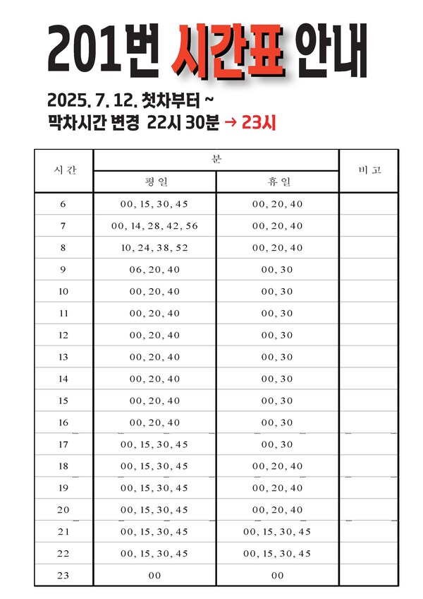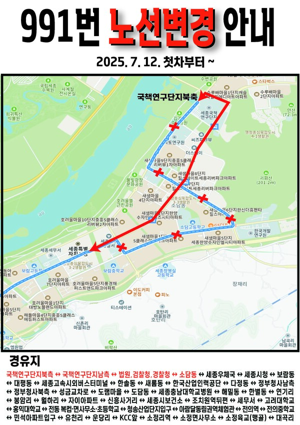 세종시가 오는 12일부터 시내버스 4개 노선의 운행 경로를 조정한다. 노선의 효율성과 안전성을 강화하고, 이용 수요에 맞춘 노선 개선을 통해 대중교통의 접근성과 편의성을 높이겠다는 목적이다. 조정 대상 노선은 201번, 272번, 273번, 991번 등 4개다. 이 가운데 201번과 273번은 BRT 중앙차로 구간의 유턴 불가 문제로 인해 교차로 안전사고 우려가 지속 제기돼 왔다. 이에 따라 201번은 어진동 방향으로 우회하도록 하고, 273번은 중소벤처기업부 경유 노선으로 변경해 유턴 구간을 제거했다. 장거리 운행으로 운수 종사자의 피로도가 컸던 991번 노선은 한누리대로를 새롭게 경유하도록 조정됐다. 기존 1번 국도를 대신해 우회 구간을 최소화함으로써 평균 운행시간은 약 10분 줄어들게 된다. 272번 노선은 3·4생활권 주민들의 출퇴근 수요를 반영해 주요 거주지 밀집 지역인 달빛로와 다정중앙로를 경유하도록 개선됐다. 이를 통해 수변상가, 주요 기관과의 접근성이 강화돼 생활권 간 통행 편의가 증대될 전망이다. 이와 함께 시는 201번 막차시간을 오후 11시까지로 30분 연장하고, 275번은 배차 간격을 기존 30분에서 25분으로 단축하는 등 시간표 조정도 병행했다. 시는 이번 조정이 시민 편의뿐 아니라 운수 종사자의 근무 여건 개선까지 고려한 조치라고 설명하며, 향후에도 이용자 의견을 지속적으로 반영하겠다고 밝혔다. /배진우 기자