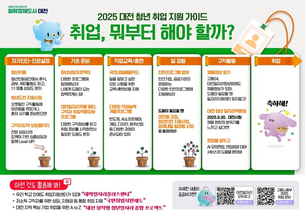 대전시는 청년들의 구직 준비 과정에서 단계별로 필요한 고용 정책을 쉽게 확인할 수 있도록 '2025 대전 청년 취업 지원 가이드'를 제작·배포했다. 이번 가이드는 고용노동부의 청년성장프로젝트와 연계해 청년이 자기진단, 진로 설정, 면접, 채용 등 준비 단계에 따라 필요한 정책을 찾아볼 수 있도록 구성됐다. 기존의 공급자 중심 나열식 정책 안내에서 벗어나 수요자인 청년 관점에서 재구성한 것이 특징이다. 가이드에는 전자책 『대전 일자리모두잡고』와 고용노동부의 취업포털 '2025 취업준비누리집'을 연동한 QR코드가 포함돼 있으며, 이를 통해 정책 상세 내용과 월별 주요 프로그램 일정을 확인할 수 있도록 했다. 해당 자료는 청년들이 고용정책을 쉽게 이해하고 활용할 수 있도록 돕는 청년성장프로젝트의 보조 도구로 활용된다. 대전 지역 청년들은 중구 선화동 '대전일자리지원센터', 동구 자양동 '동구동락', 서구 둔산동 프뢰벨빌딩 내 '청춘정거장' 등 3곳의 청년카페를 방문하거나, 대전시청 누리집 및 청년성장프로젝트 누리집을 통해 가이드를 열람할 수 있다. 권경민 대전시 경제국장은 "이번 가이드가 지역 청년들의 실질적인 구직 길잡이가 되길 기대한다"며 "앞으로도 치열한 취업 경쟁 속에서 최선을 다하는 청년들을 위해 정책적 지원을 계속 확대해 나가겠다"고 밝혔다. /이성재 기자