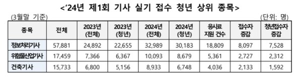 고용노동부 올 1분기 청년 38만여명이 '국가기술자격 응시료 지원사업'(이하 응시료 지원사업)을 통해 총 42억4000만원을 감면받은 것으로 알려졌다. 한국산업인력공단에서 시행하는 438개 국가기술자격시험에 응시하면서 응시료 지원을 신청하는 경우 정부가 50%를 선 지원하는 '청년 국가기술자격 응시료 지원사업'은 만 34세 이하 청년이라면 누구나 최대 3회까지 혜택을 받을 수 있다. 올 1분기 청년층 국가기술자격 접수자는 4만4880명 증가했다. 특히 정보처리기사, 위험물산업기사, 건축기사 등 기사시험에 응시하는 청년층이 지난해 비해 2만5650명 증가했다. 또한 응시료가 상대적으로 높은 기술사와 기능장 시험에 접수하는 청년층이 지난해 동기 대비 각 62.6%·35.6% 증가했다. 국가기술자격 평균 응시료는 기능사, 기사, 기능장, 기술사 순으로 높아진다. 고용노동부는 응시료 지원사업이 청년의 직업능력 개발과 경제적 부담 완화에 긍정적인 영향을 미친다고 분석했다. 응시료 지원사업에 대한 이용 방법 및 자세한 내용은 국가 자격정보 누리집(https://www.q-net.or.kr) - 공지사항에서 확인할 수 있다.