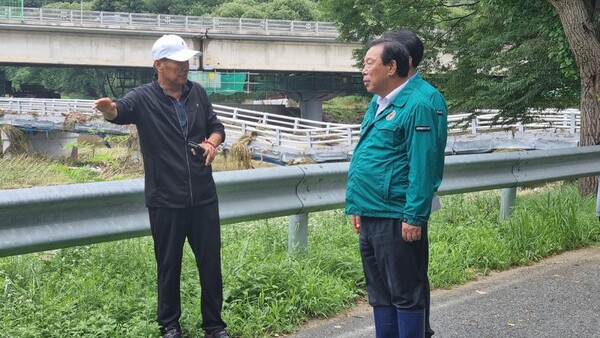 최민호 세종시장이 18일 집중호우로 인한 시민 안전 점검에 나섰다. 최 시장은 전날 300㎜가 넘는 폭우로 붕괴된 소정면 소정리 광암교를 찾아 피해 상황을 확인하고 복구 지시를 내렸다. 시는 교량 붕괴 전부터 하천 수위 상승에 따라 광암교 양방향을 통제했으며, 붕괴 직후에는 접근 금지 안전재난문자를 발송하는 등 주민 안전 조치를 이어가고 있다. 최 시장은 조치원읍 내창천으로 이동해 자율방재단이 진행하는 배수로 정비작업 현장을 살펴보고 대곡리 맹곡천 수해지역과 세종벤처밸리산업단지 진입도로 개설공사 현장을 차례로 점검했다. 이 과정에서 하천 주변 배수시설과 빗물받이, 건설현장 안전관리 상황을 확인하고 비상대응체계 유지와 안전사고 예방을 지시했다. 특히 침수 우려가 큰 지역에는 사전 대비와 주민 대피 계획 점검을 강조했다. /배진우 기자