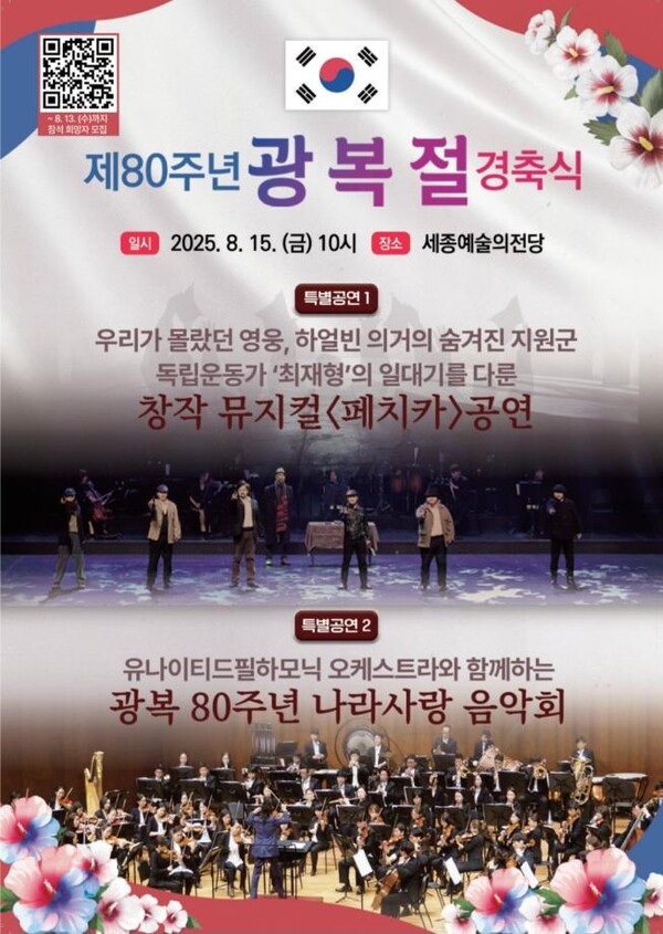세종시가 광복 80주년을 맞아 애국선열의 희생과 헌신을 기리고 국권 회복의 의미를 시민과 함께 나누는 경축식을 연다. 시는 오는 15일 오전 10시 세종예술의전당에서 제80주년 광복절 경축식을 개최한다. 행사에는 최민호 시장, 임채성 시의회 의장, 최교진 교육감, 강준현·김종민 국회의원, 독립유공자 유족과 광복회원, 보훈단체장, 주요 내빈, 시민 등 약 1000명이 참석한다. 식전에는 독립운동가 최재형과 안중근 선생의 생애를 다룬 뮤지컬 '페치카'가 무대에 오르고, 이어 국민의례, 광복절 노래 제창과 만세삼창, 경축공연이 진행된다. 경축공연은 김봉미 지휘자가 이끄는 유나이티드 필하모닉 오케스트라와 테너 이규철, 소프라노 정꽃님, 바이올리니스트 김현지 등 40여 명이 참여해 8곡의 연주로 광복의 환희와 감동을 전한다. 시민 누구나 사전 신청 없이 선착순으로 입장할 수 있다. /배진우 기자 배진우 기자 gogk88@sejongilbo.co.kr 다른기사 보기 저작권자 © 세종일보 무단전재 및 재배포 금지 당신만 안 본 뉴스 한화 불꽃축제 30일 개최…대전시, 방문객 안전 관리 강화 주민이 채우는 폐교, 지역이 키우는 공간으로 만든다 [사설] 일할 세대가 떠난다 ‘APEC 2025 미래들의 수다’, 청년 시선으로 본 인구위기 어린이 환경교육, 뮤지컬로 배우는 탄소중립 외로움 대신 연결로… 청년 위한 온라인 상담 시범 운영 반복되는 SPC 사고… 노동부 "노동강도·건강영향 재진단 필요" 한화 불꽃축제 30일 개최…대전시, 방문객 안전 관리 강화 개의 댓글 회원로그인 작성자 비밀번호 댓글 내용입력 댓글 정렬 최신순 추천순 답글순 BEST댓글 BEST 댓글 답글과 추천수를 합산하여 자동으로 노출됩니다. 닫기 더보기 댓글삭제 삭제한 댓글은 다시 복구할 수 없습니다. 그래도 삭제하시겠습니까? 비밀번호 닫기 댓글수정 댓글 수정은 작성 후 1분내에만 가능합니다. 본문 / 400 비밀번호 닫기 내 댓글 모음 닫기 주요기사