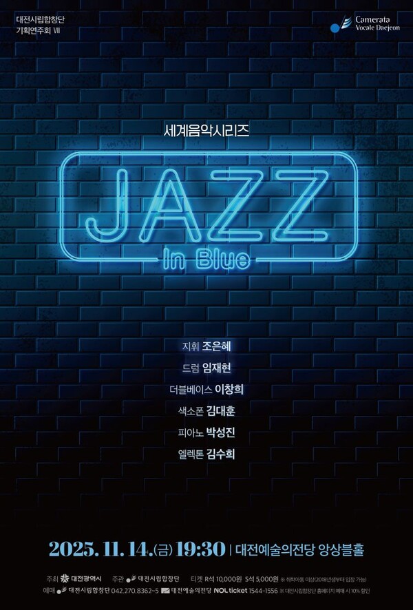 대전시립합창단, 14일 세계음악시리즈 '재즈 인 블루' 대전시립합창단이 14일 대전예술의전당 앙상블홀에서 세계음악시리즈 '재즈 인 블루'를 선보인다. 올해 공연은 재즈를 주제로 구성됐으며 블루 노트 감성을 기반으로 한 발라드, 아카펠라, 미사곡 등을 합창 형태로 재해석하는 데 초점을 맞췄다. 무대는 대중적으로 익숙한 팝을 합창으로 편곡한 곡들로 시작한다. Autumn Leaves, When I Fall in Love, Fly Me to the Moon 등이 재즈 리듬과 하모니를 결합한 형태로 등장해 공연의 분위기를 자연스럽게 끌어올릴 예정이다. 이후에는 밥 칠콧의 작은 재즈 미사가 이어진다. 전통적인 미사문에 현대적 재즈 요소를 결합한 작품으로, 블루스 특유의 질감과 재즈의 유연한 흐름을 동시에 드러내는 게 특징이다. 세 번째 순서는 사중창과 독창 중심의 재즈 프로그램이다. Dreams, Java Jive가 아카펠라로 연주되며, 드라마 우리들의 블루스 삽입곡으로 알려진 Quando Quando Quando가 독창 무대로 구성된다. 마지막은 루이 암스트롱과 듀크 엘링턴의 레퍼토리로 시작해 Isn't She Lovely, In the Mood 등 경쾌한 재즈와 블루스가 이어지는 피날레가 마련된다. 밴드 사운드와 합창이 결합한 대형 편성이 공연의 마무리를 장식한다. 입장료는 R석 10000원, S석 5000원이며 예매는 대전시립합창단과 대전예술의전당, 인터파크 홈페이지에서 진행된다. /이성재 기자 이성재 기자 a1065@sejongilbo.co.kr 다른기사 보기 저작권자 © 세종일보 무단전재 및 재배포 금지 당신만 안 본 뉴스 한화 불꽃축제 30일 개최…대전시, 방문객 안전 관리 강화 주민이 채우는 폐교, 지역이 키우는 공간으로 만든다 [사설] 일할 세대가 떠난다 ‘APEC 2025 미래들의 수다’, 청년 시선으로 본 인구위기 어린이 환경교육, 뮤지컬로 배우는 탄소중립 외로움 대신 연결로… 청년 위한 온라인 상담 시범 운영 반복되는 SPC 사고… 노동부 "노동강도·건강영향 재진단 필요" 한화 불꽃축제 30일 개최…대전시, 방문객 안전 관리 강화 개의 댓글 회원로그인 작성자 비밀번호 댓글 내용입력 댓글 정렬 최신순 추천순 답글순 BEST댓글 BEST 댓글 답글과 추천수를 합산하여 자동으로 노출됩니다. 닫기 더보기 댓글삭제 삭제한 댓글은 다시 복구할 수 없습니다. 그래도 삭제하시겠습니까? 비밀번호 닫기 댓글수정 댓글 수정은 작성 후 1분내에만 가능합니다. 본문 / 400 비밀번호 닫기 내 댓글 모음 닫기 주요기사